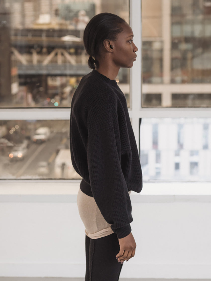 Organic cotton knit pullover with crewneck and dropped shoulders.