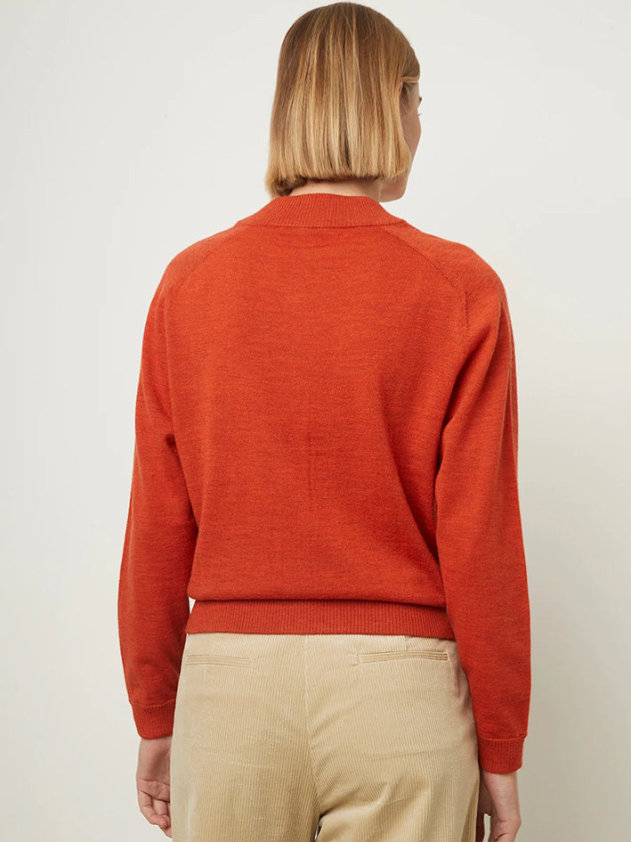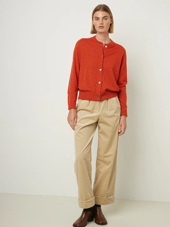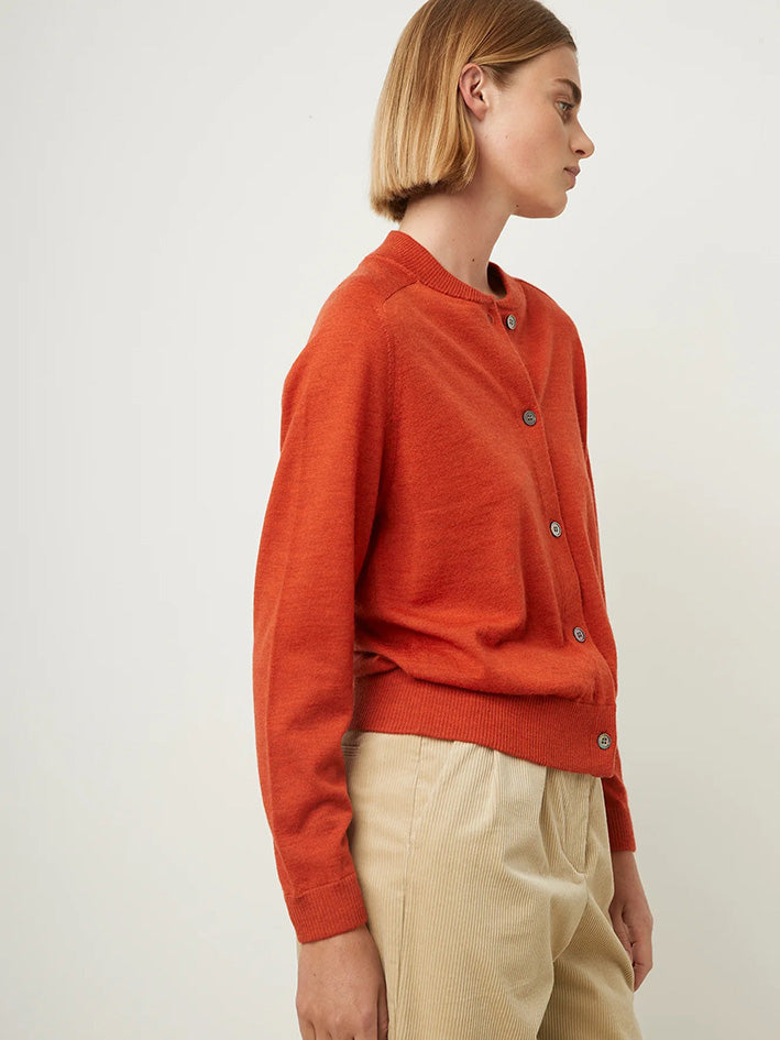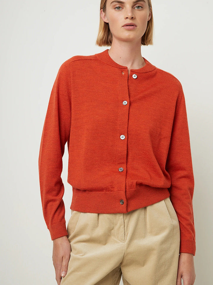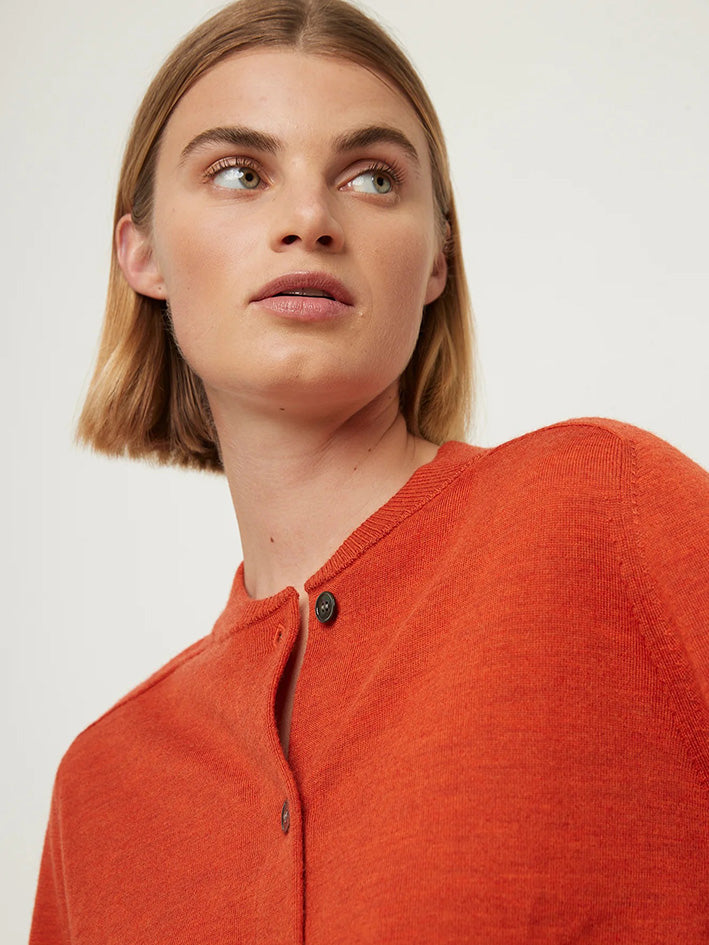 This Rue Blanche Meri Cardigan Orange is made from an extra fine merino wool yarn for a fluid drape in coral red. It features a button closure, a straight cut, and a fitted waistband to crop the garment at the hips. We designed this preppy knit to become a versatile wardrobe classic, but added intrigue with raglan reminiscent shoulders and a baseball neckline.