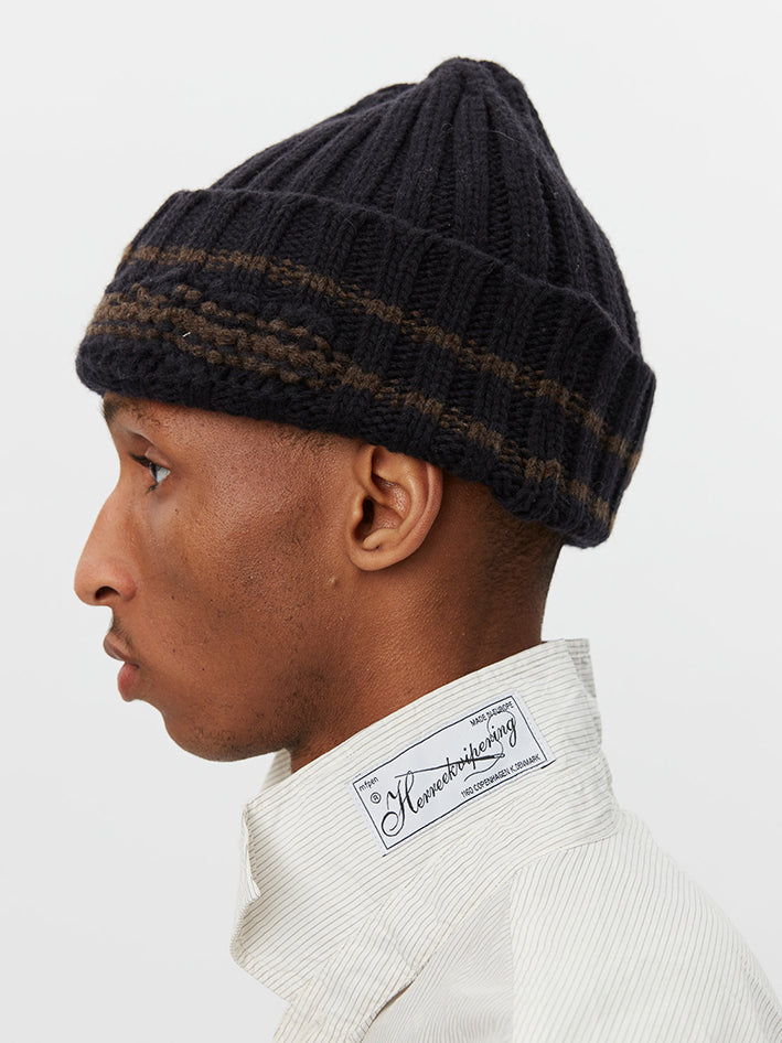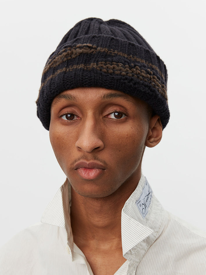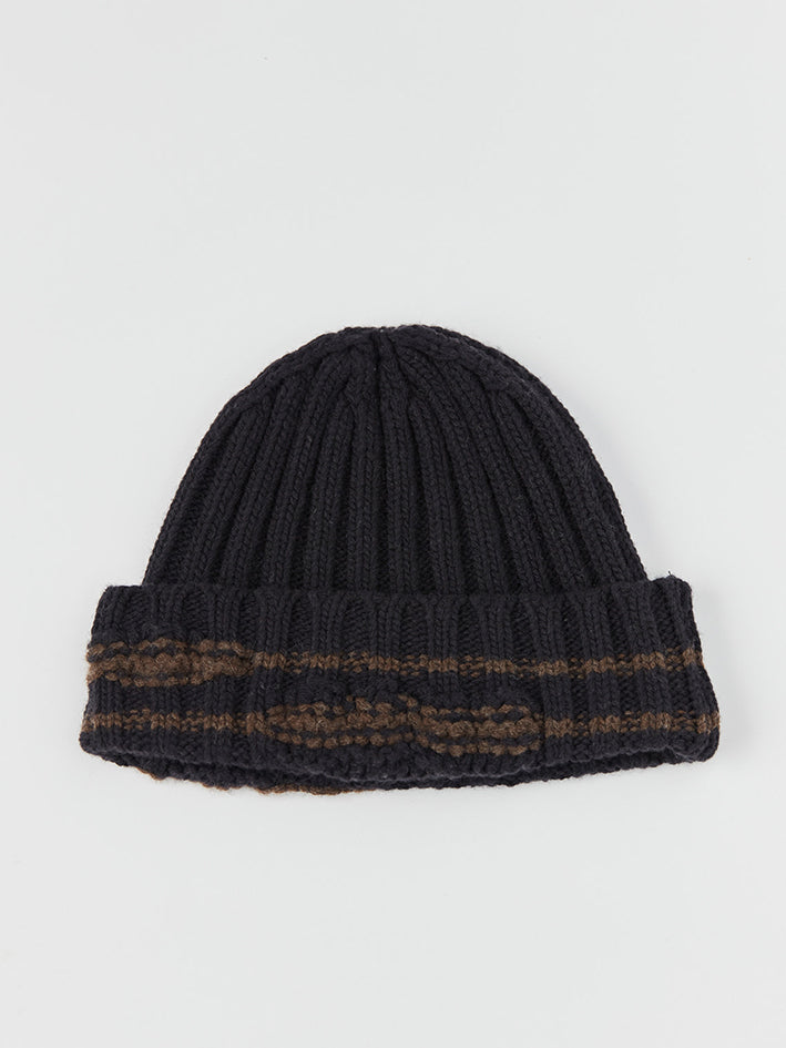The mfpen Court Beanie is knitted from black recycled Italian wool yarn, with dark brown irregular stripes at the fold.