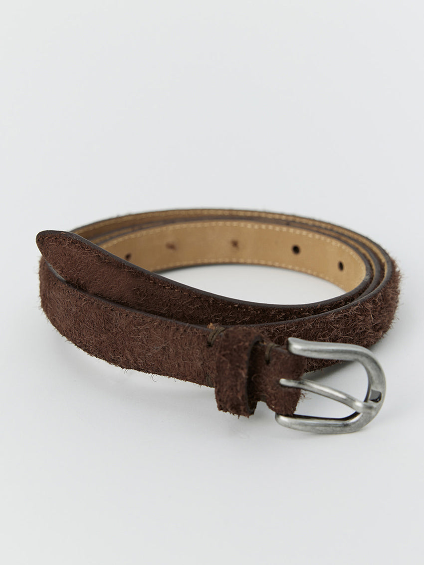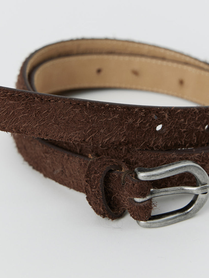 The Purpose Belt is crafted from a brown fuzzy suede with a natural leather backing.