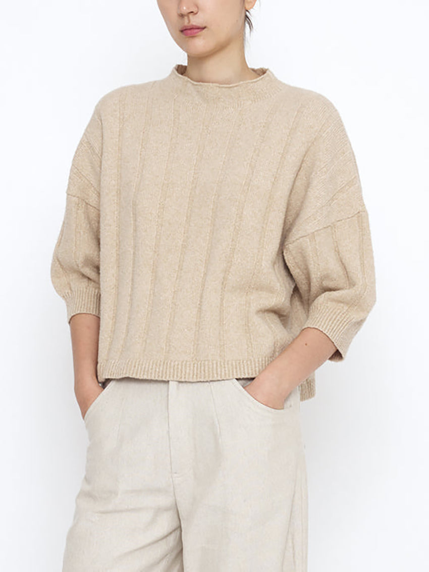A mockneck sweater with graceful poet sleeves at a 3/4 length.