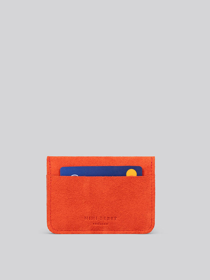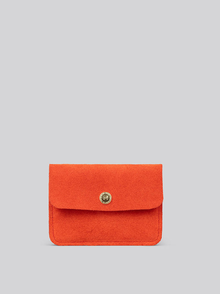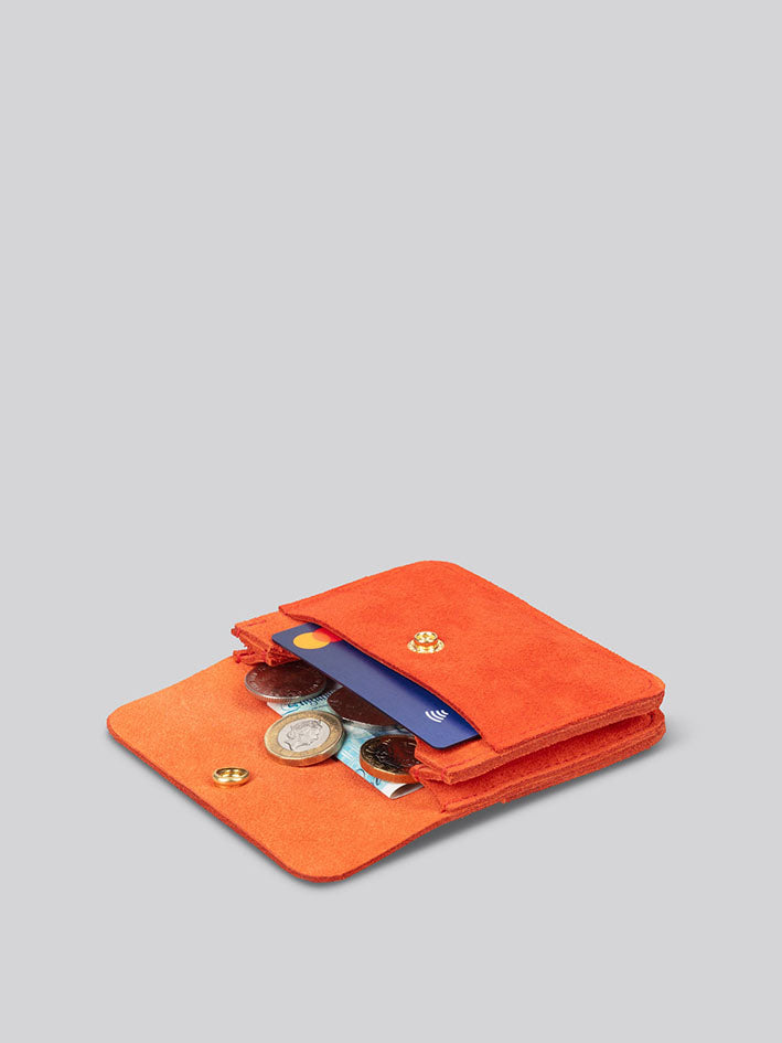Coin & card expandable Mimi Berry Dolly Small Suede Wallet in Marmalade, fastened with an engraved brass popper.