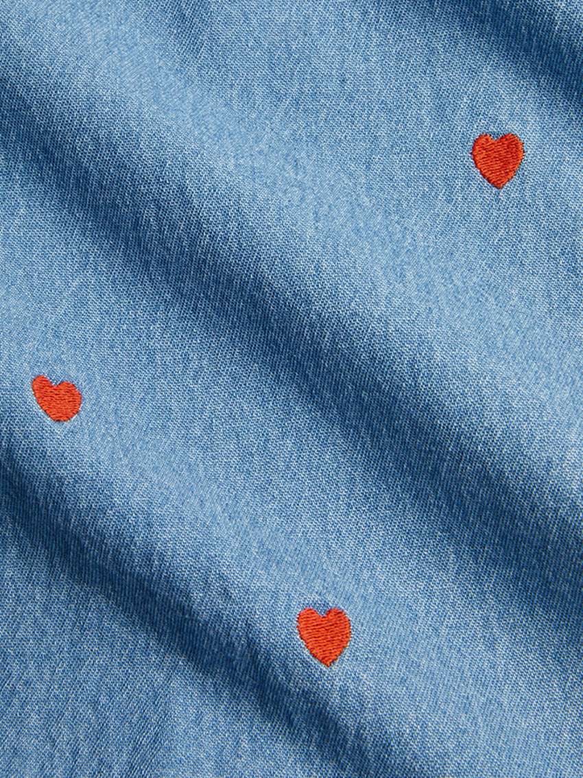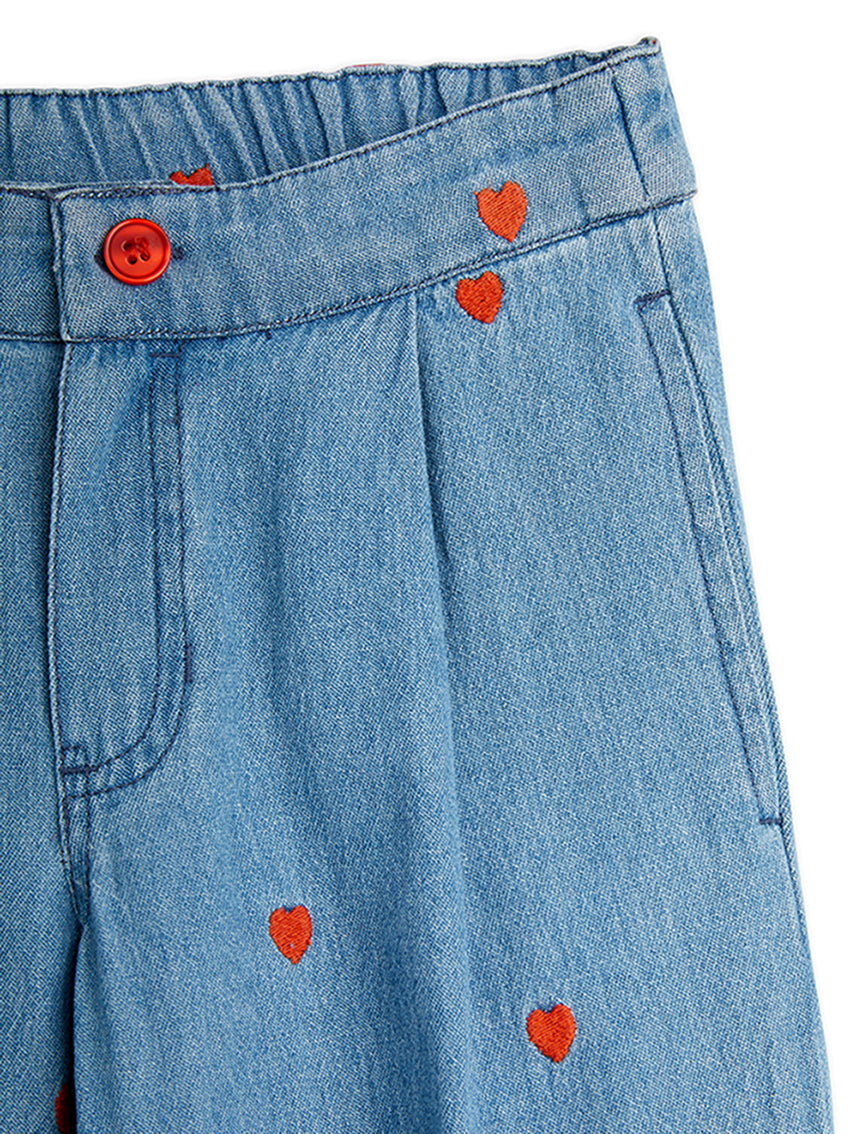 Mini Rodini Mini Hearts Woven Trousers Blue, relaxed tapered-fit jeans in 100% GOTS-certified organic cotton, with embroidered red mini hearts, side pockets, and an elastic waist with red button. No zipper – for easy dressing.