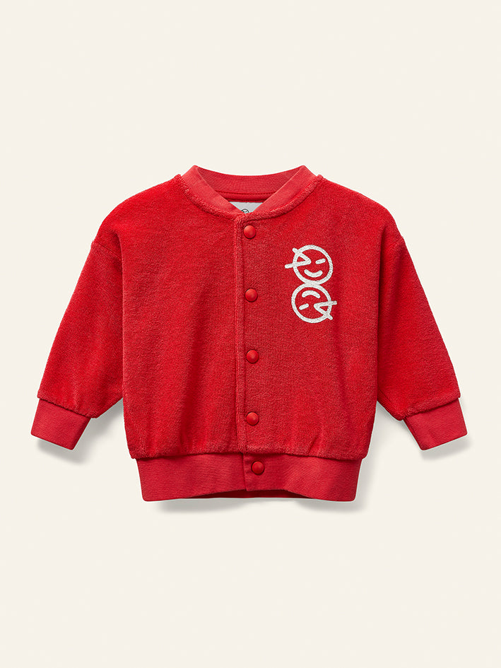 Roomy and relaxed fit Mini Keel Terry Bomber Setting Sun in softest organic cotton. This style has rib on the hem, cuffs and neck for added comfort and our friendly Wynken logo printed on the chest.