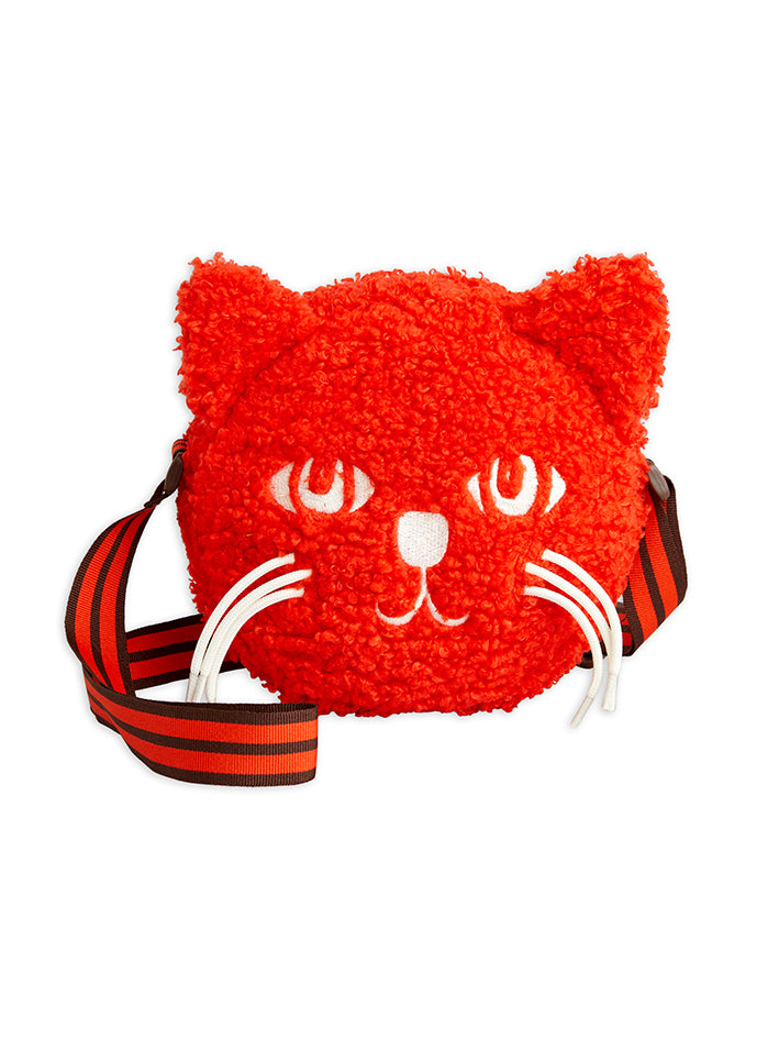 The Mini Rodini Cat Fuzzy Mini Bag Red in 100 % recycled polyester. Designed with an adjustable striped shoulder strap, zip closure and polyamide lining. Decorated with whiskers detailing.