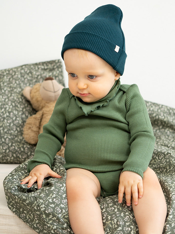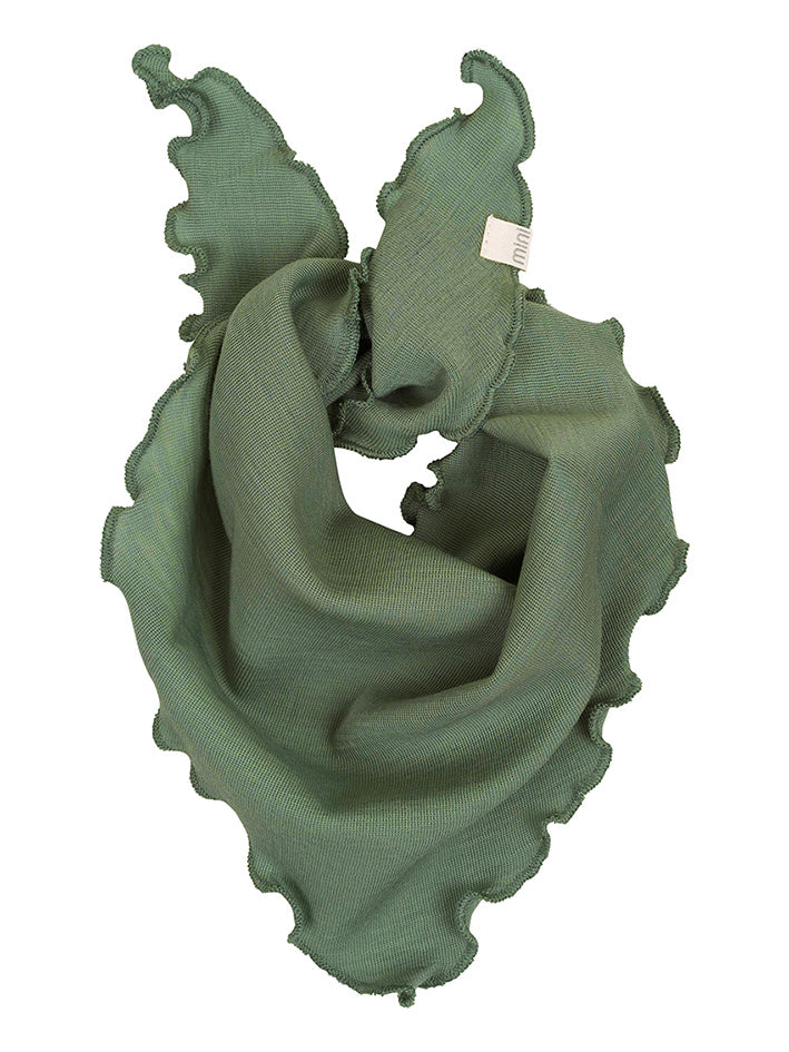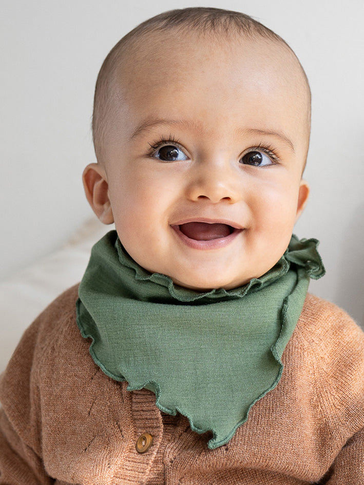 Baby girls and boys soft bandana Bib in Greenery by Minimalisma. This triangle scarf/bib is made in a soft merino rib to keep your baby dry and warm. Compared to cotton, wool can absorb much more moist, making it the perfect bib for teething children. At the same time, wool is antibacterial and suitable as a first layer. This bib is ideal for winter as it will not get cold when wet, but keep your babies chin dry - and avoid any rash. Quality: 100% Merino Wool