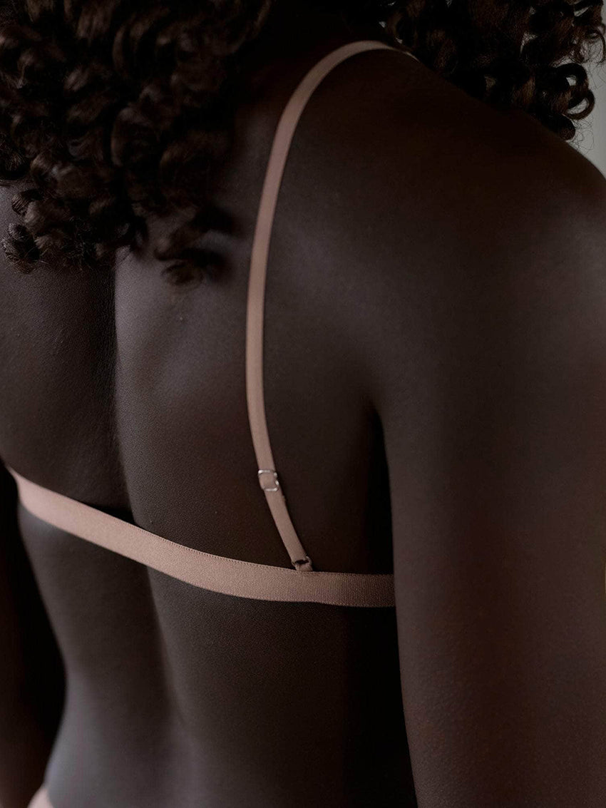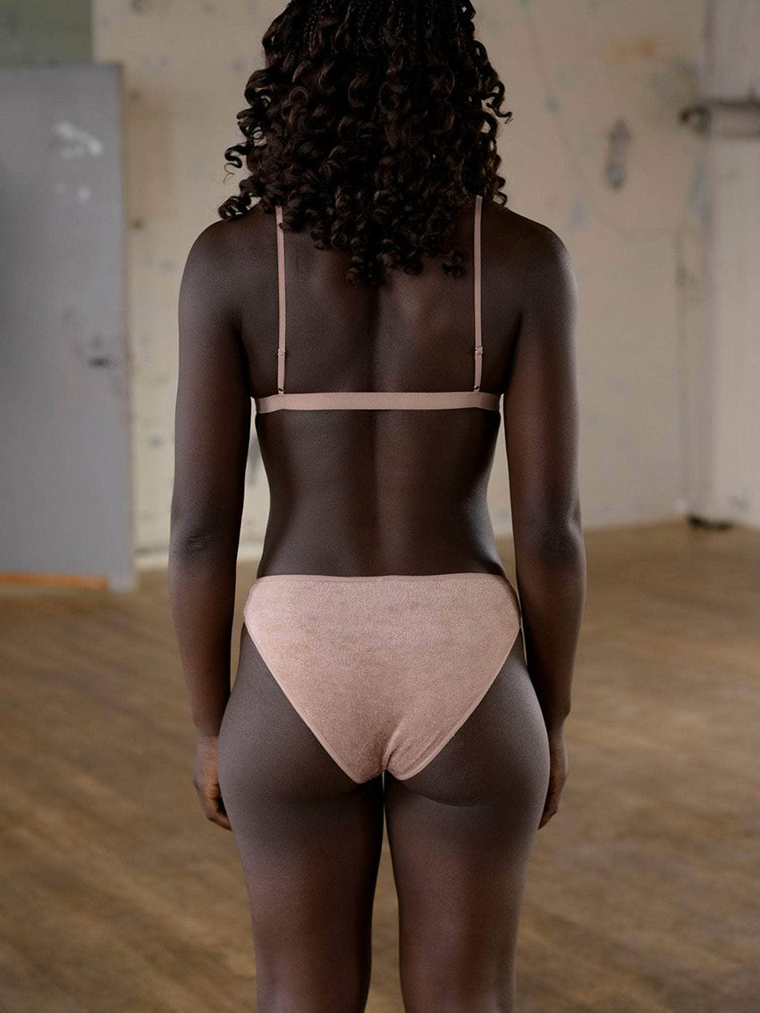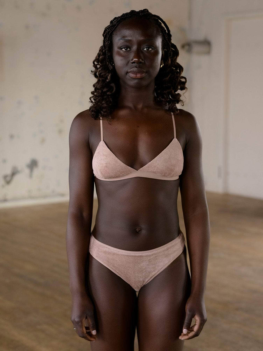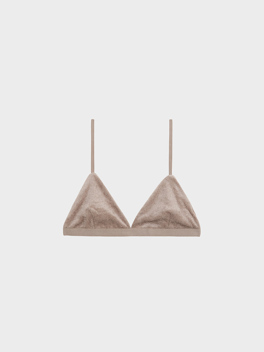 A velour bra with chest darts, thin elastic trim at the hem, and adjustable straps. Self-lined for comfort and supportive for small to medium busts.