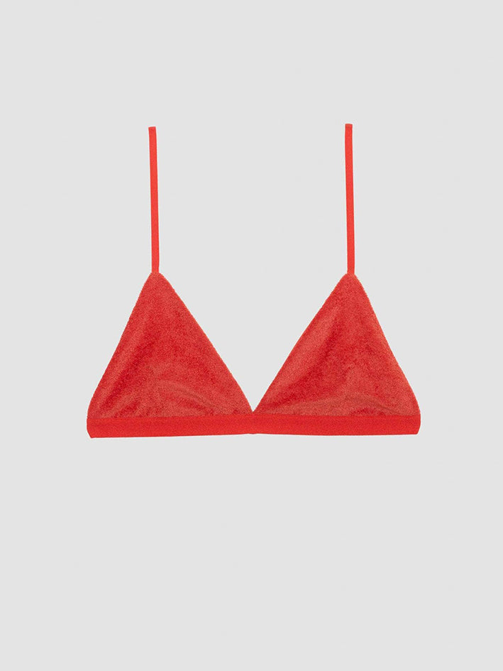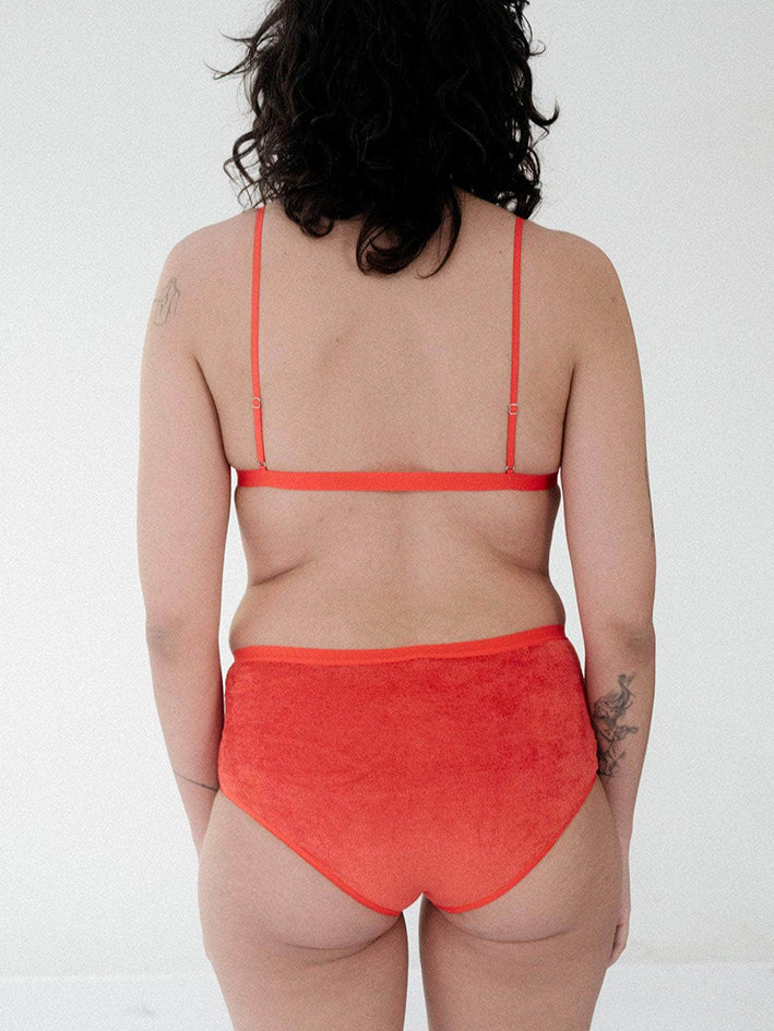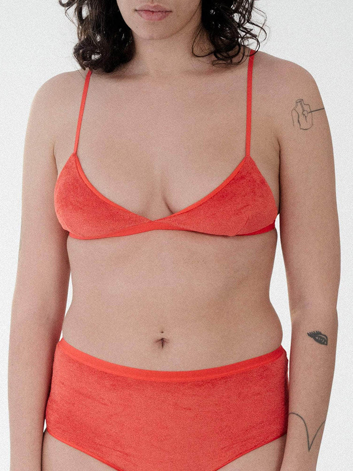Velour Mississippi Bra in Mino Red from Baserange Darts at chest Thin elastic trim at hem Thin adjustable straps Self lined Supportive for medium and small bust 88% Ecovero Viscose 12% Recycled Polyester Made in Portugal Model wears a size S