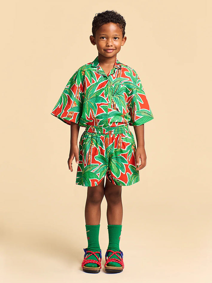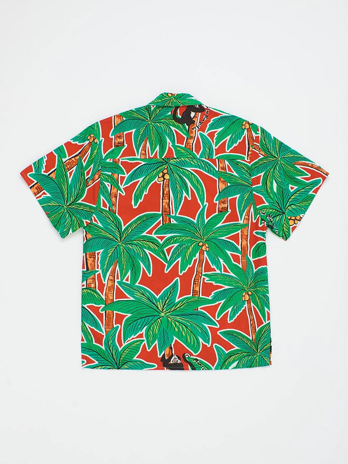 The Monkey Forest Shirt in Red by Maison Mangostan, with an oversize fit, features an allover Monkey Forest print. It has short sleeves, a lapel collar, and is fastened with corozo buttons 100% Cotton. Made in India. This product sizes normally, we suggest taking your usual size