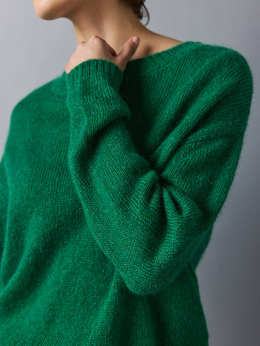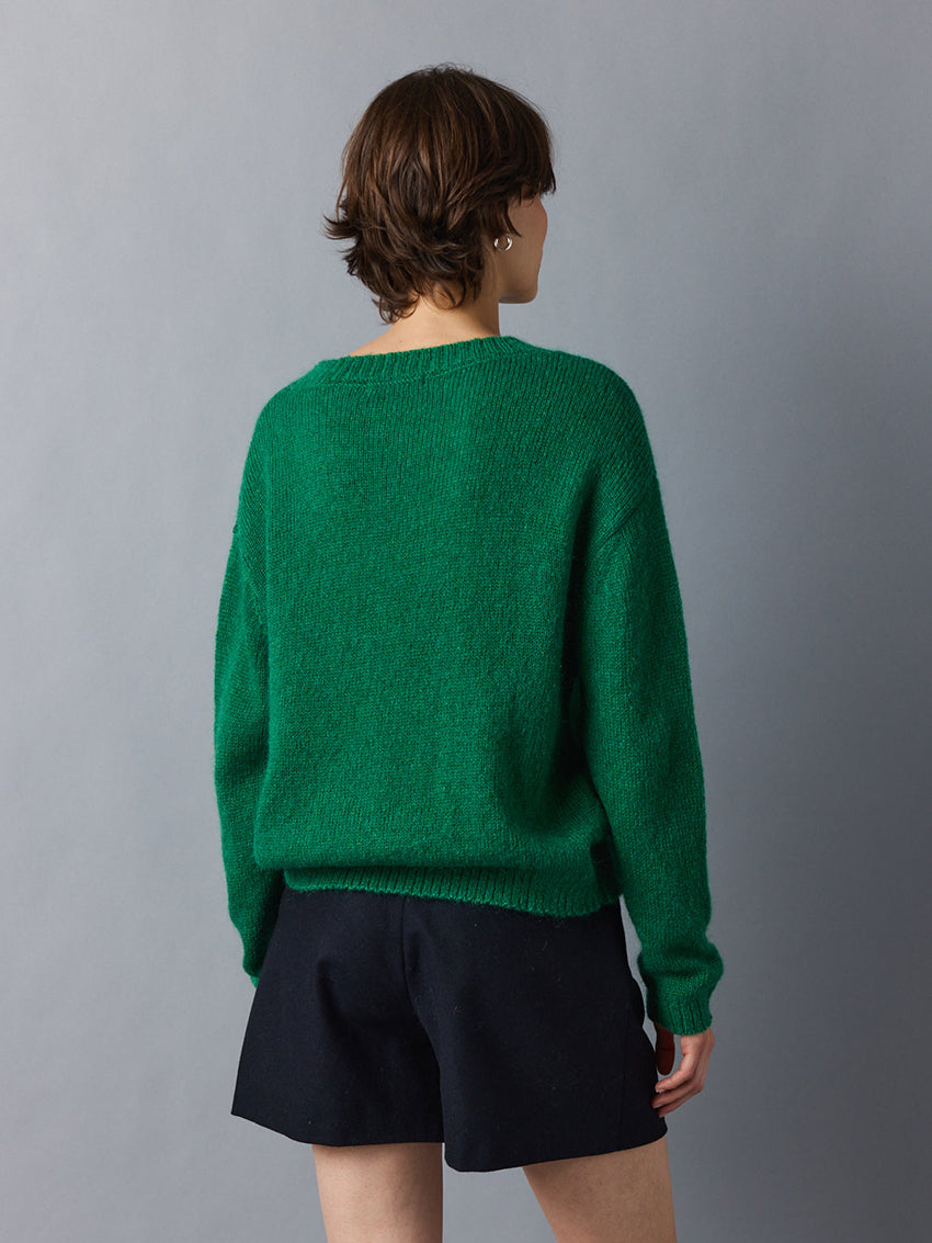 This relaxed sweater is knitted in a lightweight mohair blend with a slightly fluffy texture.