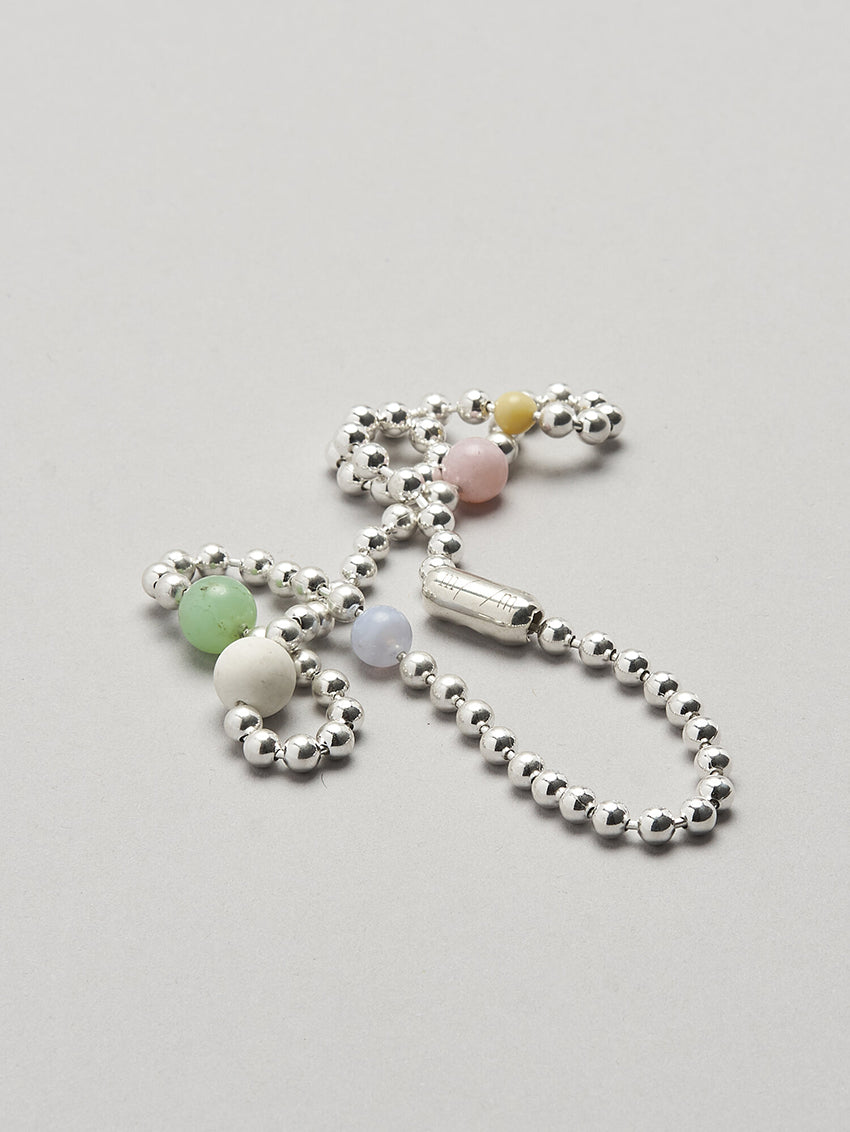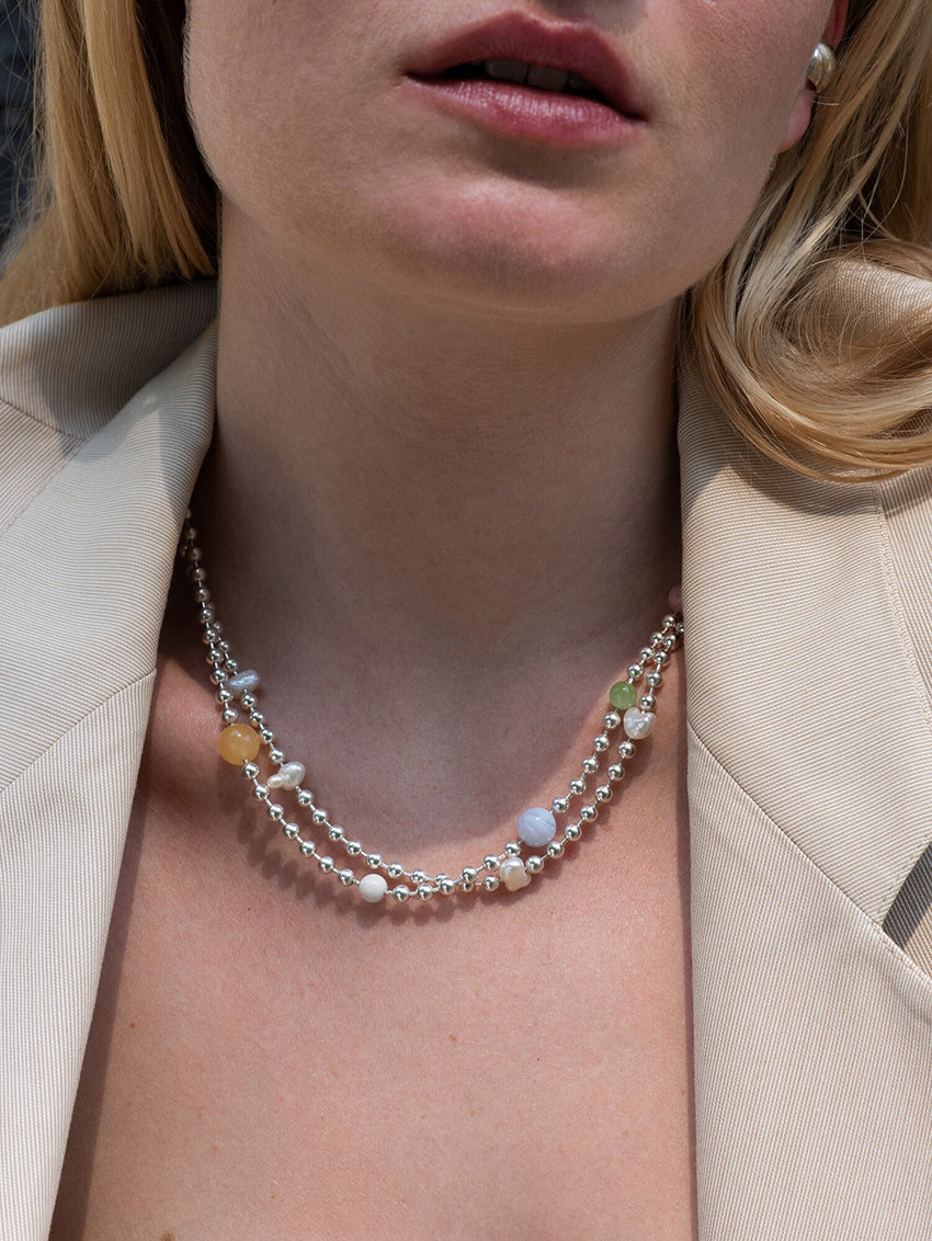 Sterling silver / 3,5mm ball chain / 42cm chain lenght / 5 recycled semi-precious stones like pink moonstone, green chrysoprase or light blue chalcedony.