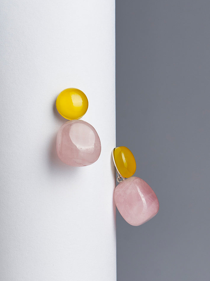 Attached to a lemon agate hemisphere, a rose quartz pebble that gently swings according to the wearer's movements. Each stone is unique in color and form, making it just as distinctive as its wearer.