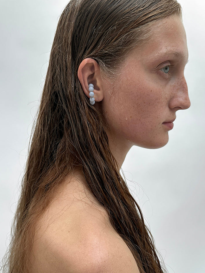 These colorful Spheres Earcuff by Mussels ans Muscles are made from mixed semiprecious stone spheres in rose quartz or light green jade. Wear it on its own, or make it a colourful addition to your ear jewelry.