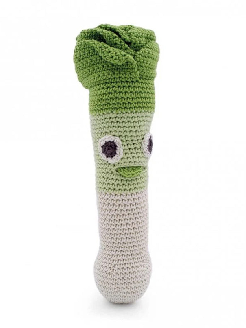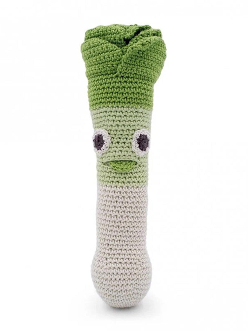 Hercule Leek Rattle by Myum is made of 100% organic cotton. This is a Montessori inspired toy. Its texture in braided mesh stimulates the baby sensory and kinesthetic capacities. And the rattle it contains attracts its attention. The padding is also in cotton. Zero waste, its corn fiber packaging is reusable, recyclable and compostable. This toy is handmade by our crafts, women with fairy fingers. This toy is suitable from birth. It is tested by European (EN71 1.2,3 and 9) and American (ASTM F963) standards. It can be brought to the mouth safely. It is washable in machine (30°C). It is repairable and made to last, first a rattle, then a toy for the kitchen play.
