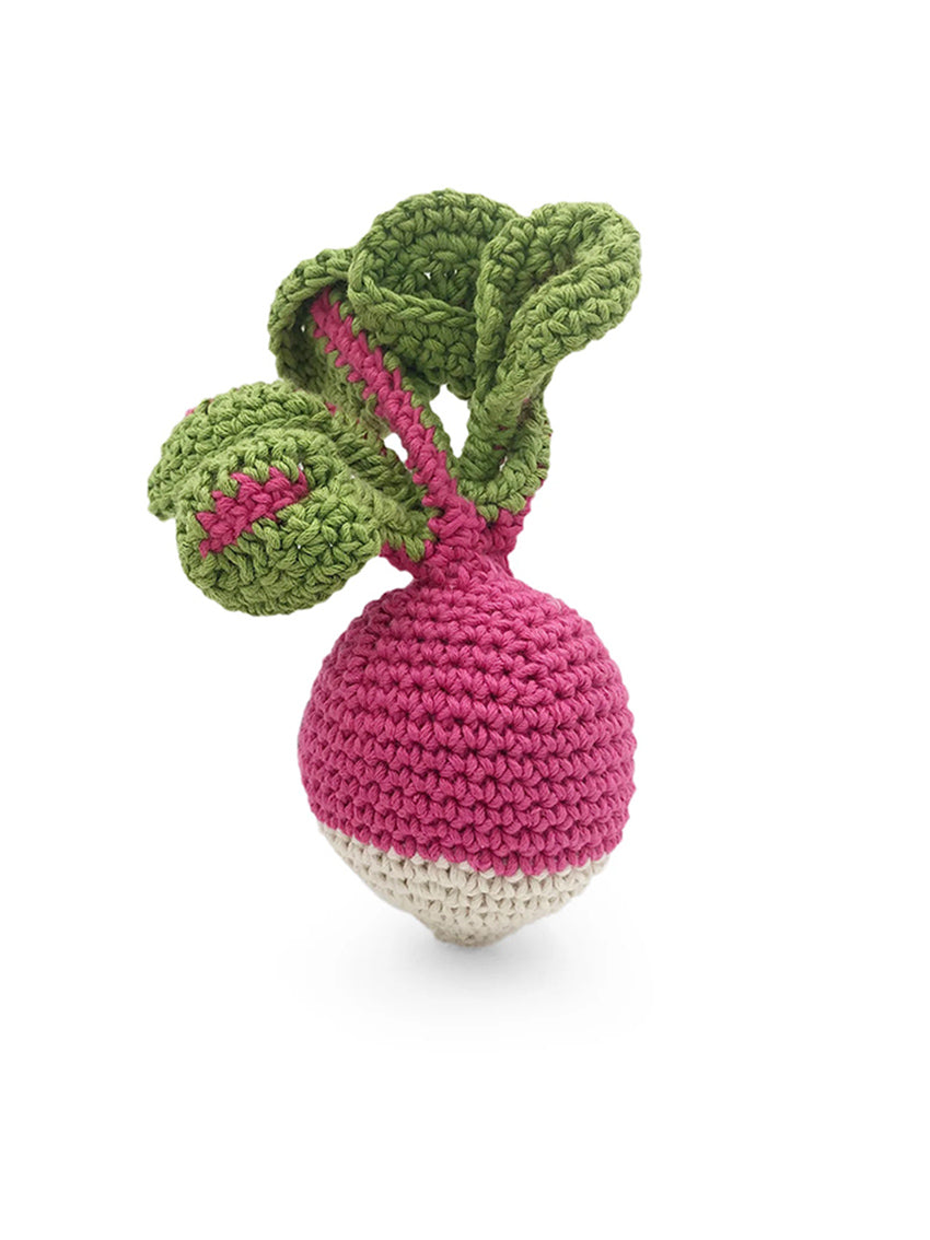 Radish Rattle by Myum is made of 100% organic cotton This is a Montessori inspired toy. Its texture in braided mesh stimulates the baby sensory and kinesthetic capacities. And the rattle it contains attracts its attention. The padding is also in cotton. Zero waste, its corn fiber packaging is reusable, recyclable and compostable. This toy is handmade by our crafts, women with fairy fingers. This toy is suitable from birth. It is tested by European (EN71 1.2,3 and 9) and American (ASTM F963) standards. It can be brought to the mouth safely. It is washable in machine (30°C). It is repairable and made to last, first a rattle, then a toy for the kitchen play.