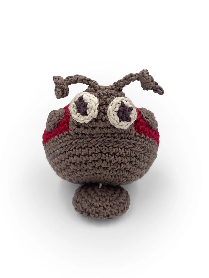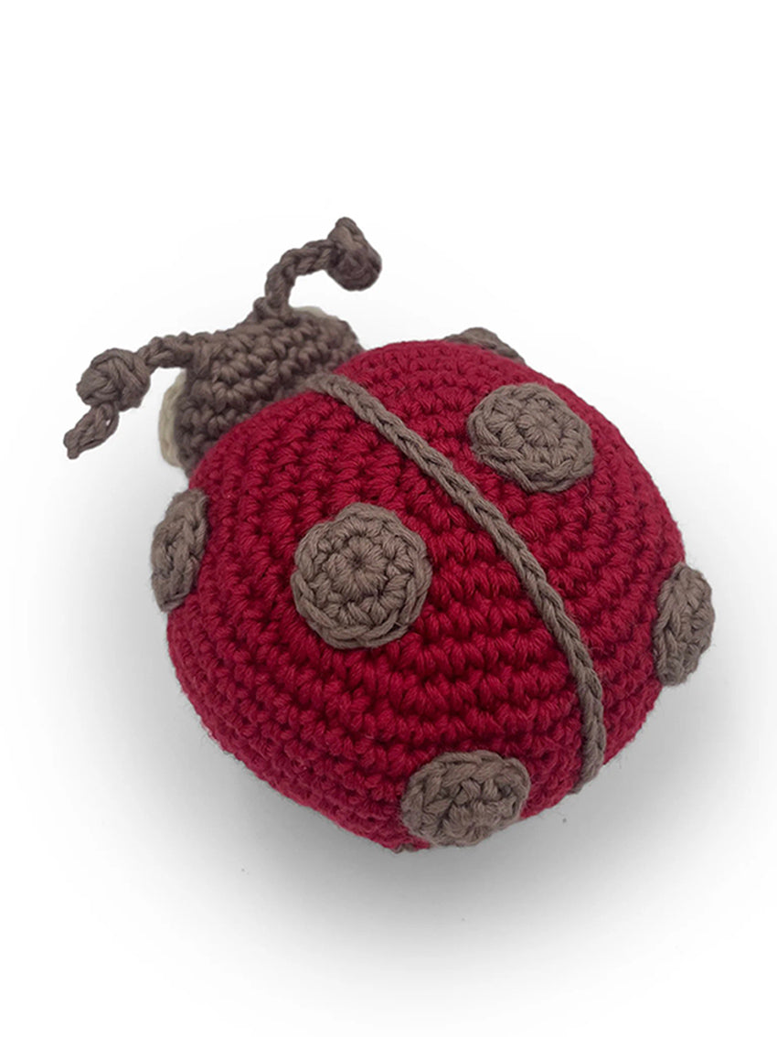 Theodora Red Ladybug Soothing Toy by Myum is made of 100% organic cotton. This is a Montessori toy. Its braided knit texture mixed with cotton muslin stimulates kid's sensory and kinesthetic abilities. The bee has a pull tab on its back. The child activates the toy and the vibration is triggered. The padding is also in cotton. Zero waste, its corn fiber packaging is reusable, recyclable and compostable. This toy is handmade by our crafts, women with fairy fingers. t is suitable from birth. But the best age is from 12 months. It is tested by European (EN71 1.2,3 and 9) and American (ASTM F963) standards. It can be brought to the mouth safely. It is washable in machine (30°C). It is repairable and made to last. The mechanism works without battery.