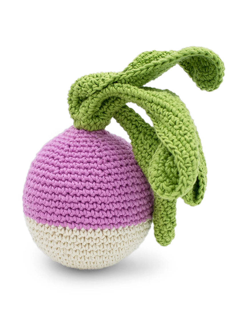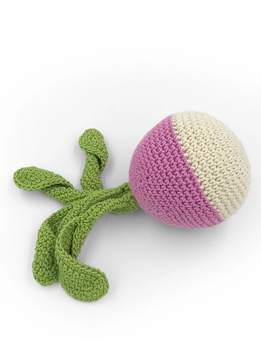 The Turnip Rattle by Myum is made of 100% organic cotton. This is a Montessori inspired toy. Its texture in braided mesh stimulates the baby sensory and kinesthetic capacities. And the rattle it contains attracts its attention. The padding is also in cotton. Zero waste, its corn fiber packaging is reusable, recyclable and compostable. This toy is handmade by our crafts, women with fairy fingers. This toy is suitable from birth. It is tested by European (EN71 1.2,3 and 9) and American (ASTM F963) standards. It can be brought to the mouth safely. It is washable in machine (30°C). It is repairable and made to last, first a rattle, then a toy for the kitchen play.