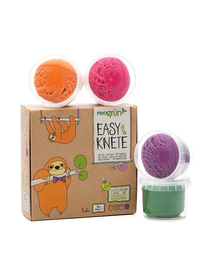 Children express their imagination in their own unique way. To give shape to their unlimited ideas, they created especially soft and easily malleable neogrün® Easy Clay. Combination of natural eco-friendly ingredients and refined vegetable pigments makes the creative experience safe, sustainable and colorful. With neogrün® Easy Clay the young artists can develop their motor skills and express themselves in a peaceful and focused way. neogrün® Easy Clay is extra-soft and elastic that allows not only modeling, but also squeezing, imprinting, stamping and spreading on paper to create 3D-pictures. After some hours in the air, the clay begins to dry, yet keeps the initial shape and glossiness after drying. This way, your creations can be preserved for the family gallery or further painted with neogrün® finger paints. We recommend protecting the modeling clay from light when not in use in order to preserve the luminosity of the vegetable dyes.
