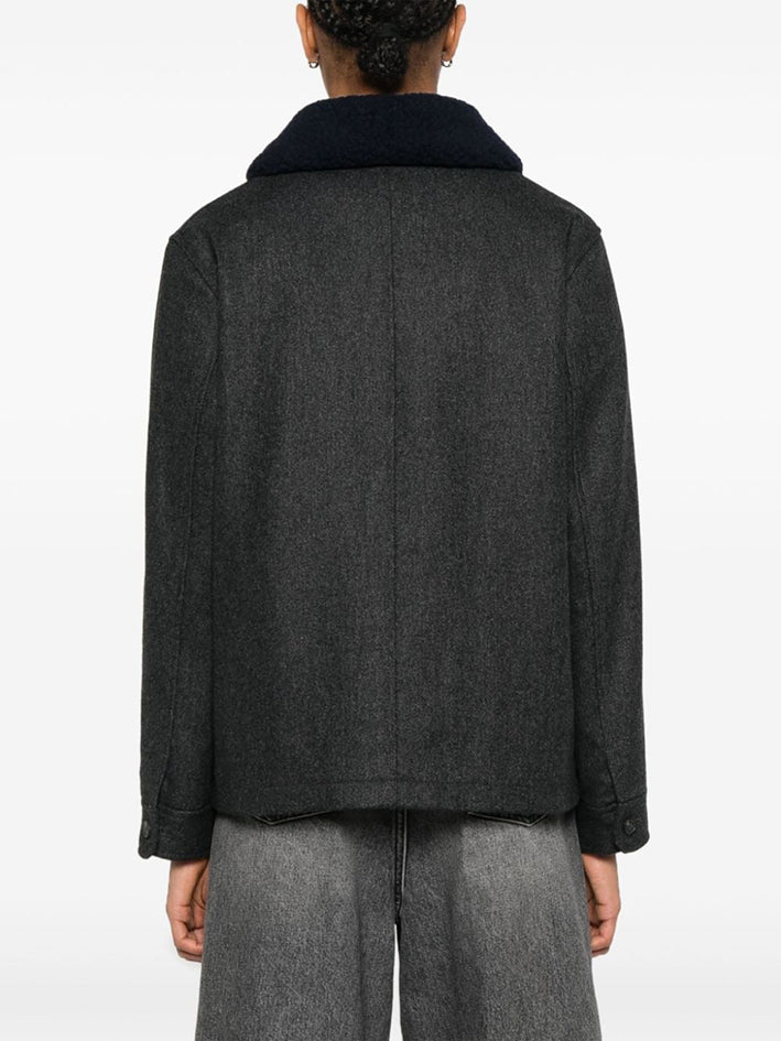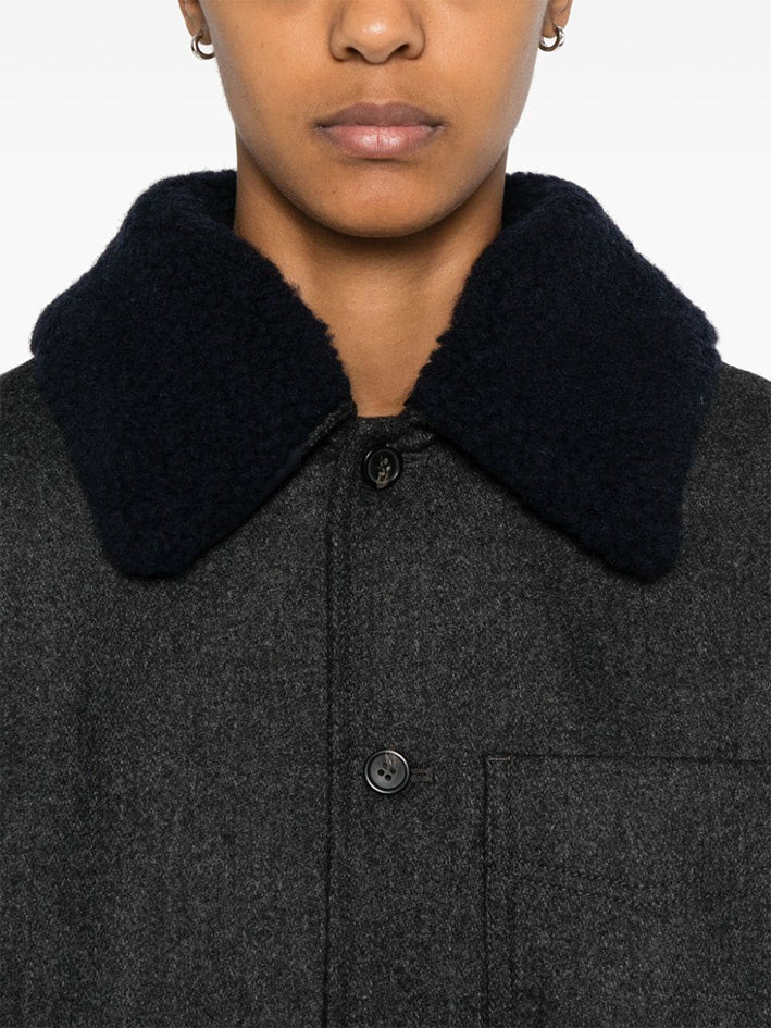 Workwear-style jacket in Antharcite Grey wool with removable navy wool fur collar.