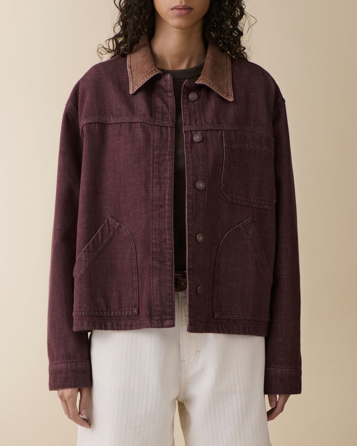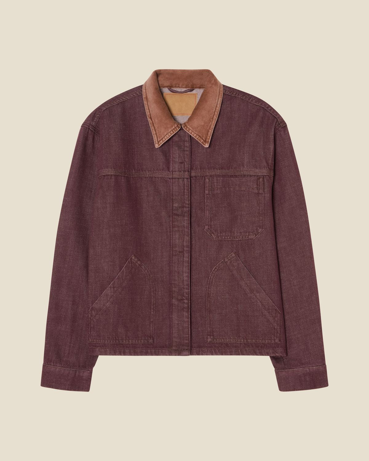 The 'Nua' denim jacket offers a contemporary twist on our previous model Nora, with a hidden button closure, classic worker jacket details, a cord collar and a shorter boxy silhouette.