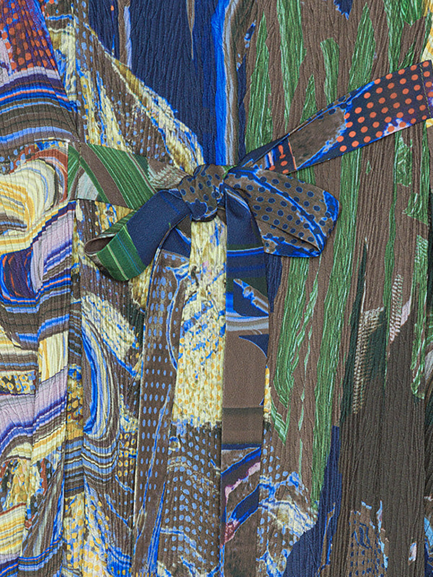 Fatures a multicolour abstract print, wrinkled pleats, a round neck, long sleeves, waist tie and flowy design.