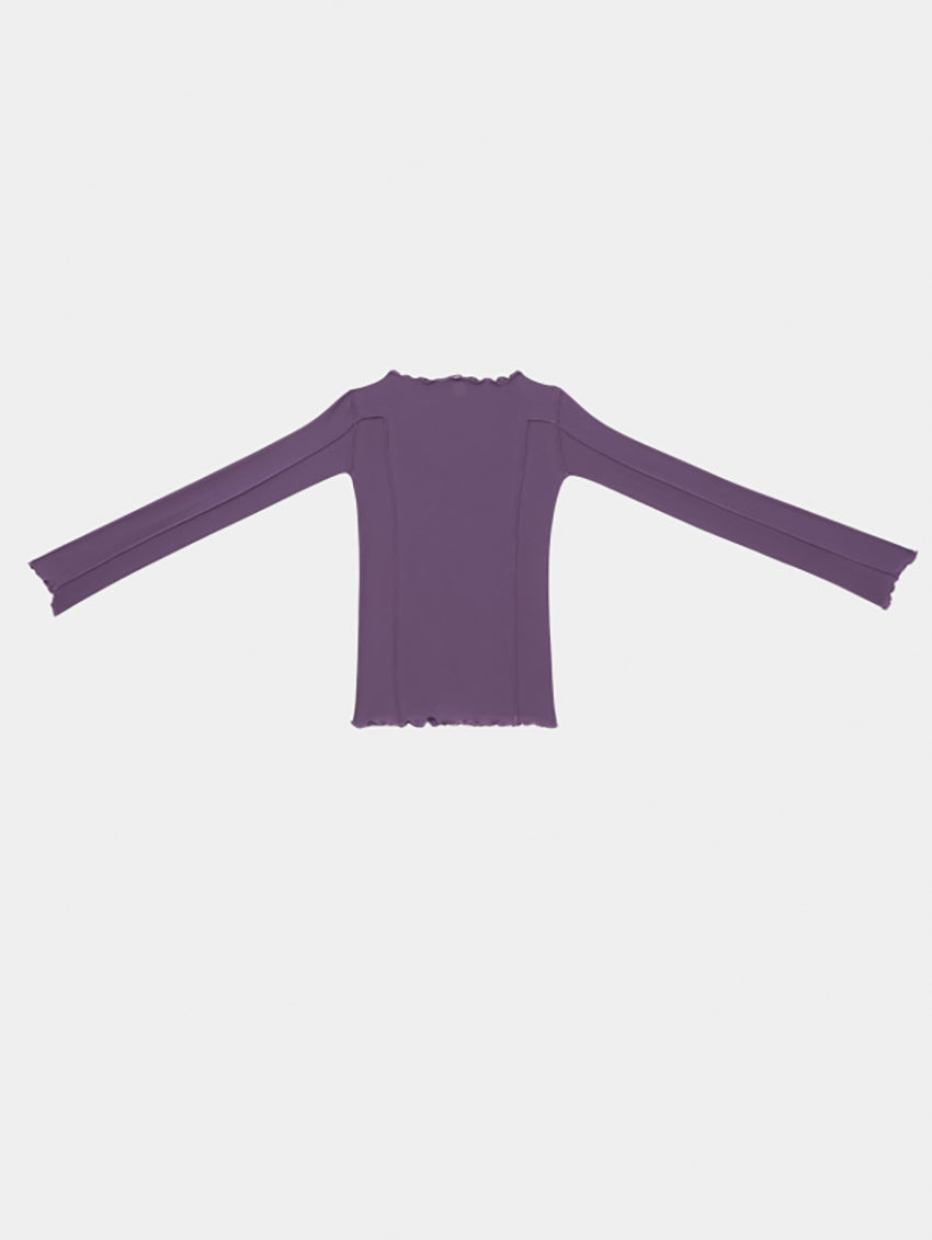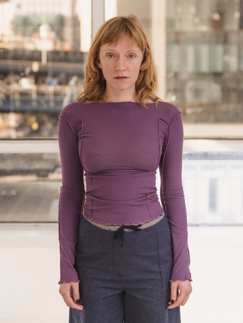 Organic cotton rib long sleeve with boatneck, exposed contrast seams, lettuce edge at neckline and hems.