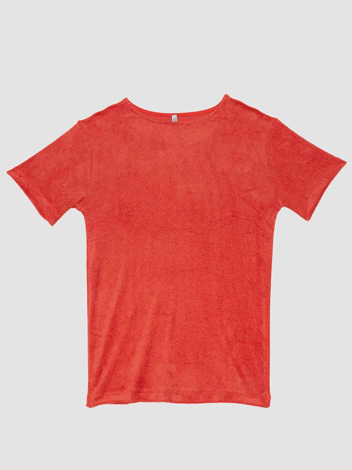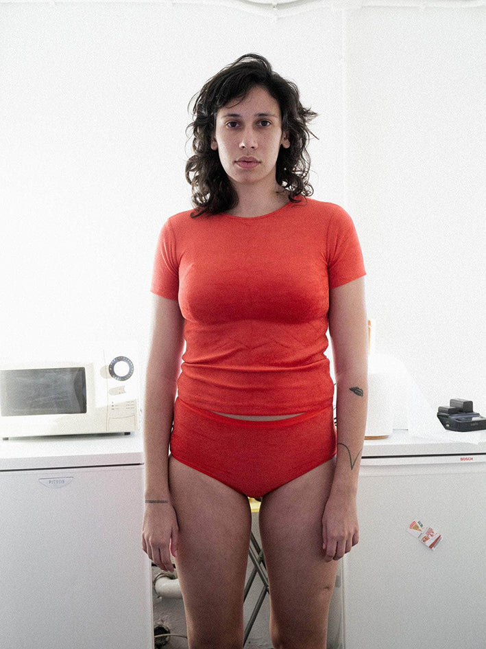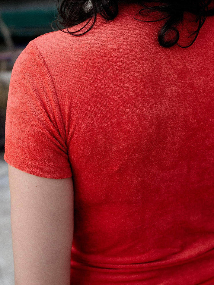 Velour Omo Tee in Mino Red from Baserange Crewneck 88% Ecovero Viscose 12% Recycled Polyester Made in Portugal Model wears a size S