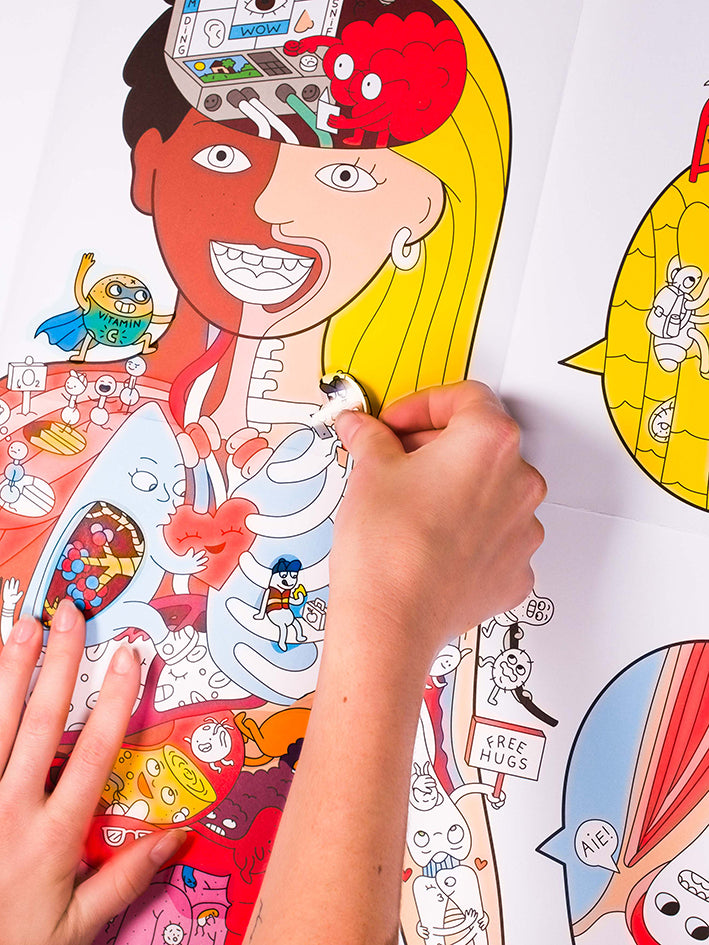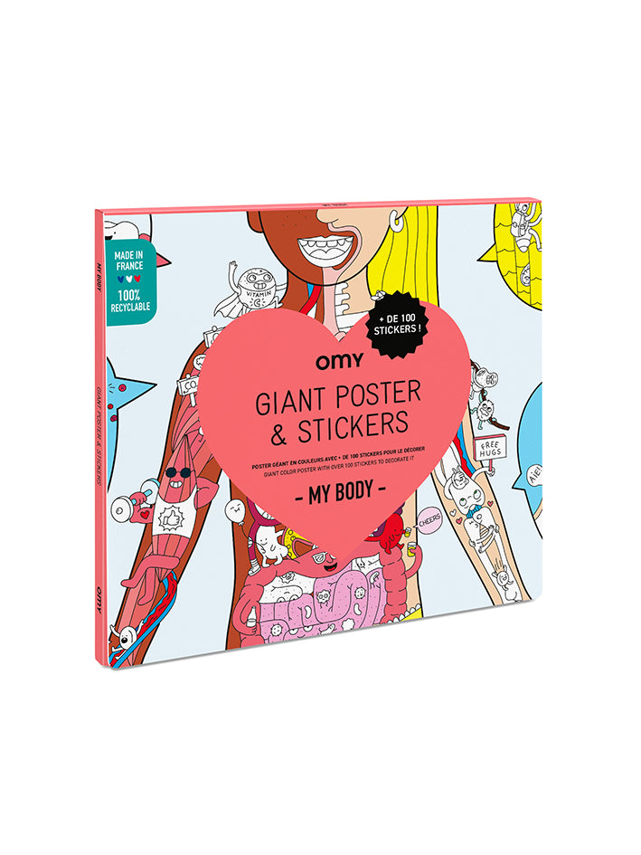 MY BODY - STICKER POSTER OMY - Giant poster + 100 stickers A fun activity to discover your body from head to toe ! Follow your kids growth with the growth chart on poster Hours of fun with a giant Search and find activity with more than 100 stickers to play with. Neon fun illustrations Format Unfolded : 39,4 x 27,6 in Composition 100 % paper Made and designed in France by OMY