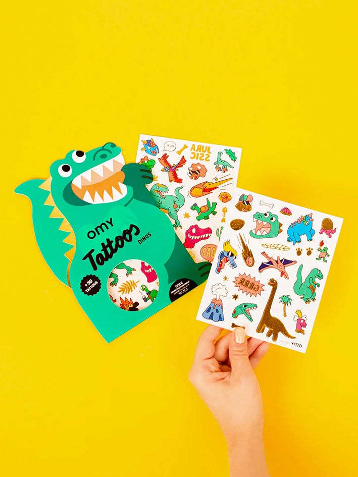 The Dinosaurs are settling on your skin! Discover inside this pouch, 50 fluorescent, gold and colored temporary OMY Tattoos to stick anywhere all year round. In addition to being simple to use, the tattoos are resistant and dermatologically tested. FROM 3 YEARS OLD