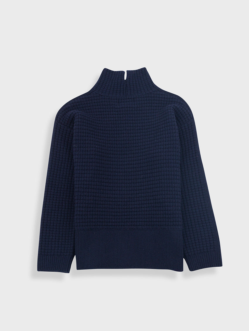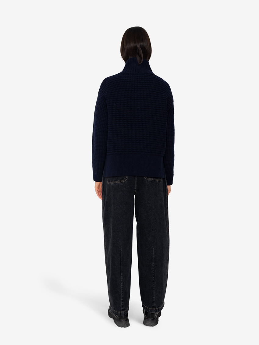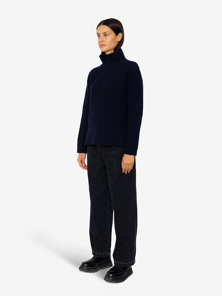 Super soft and versatile knitted wool blend Jumper in Navy by Folk with high Neck and wide cut.