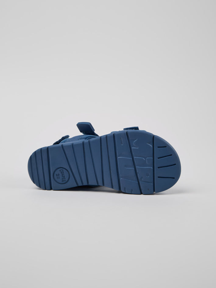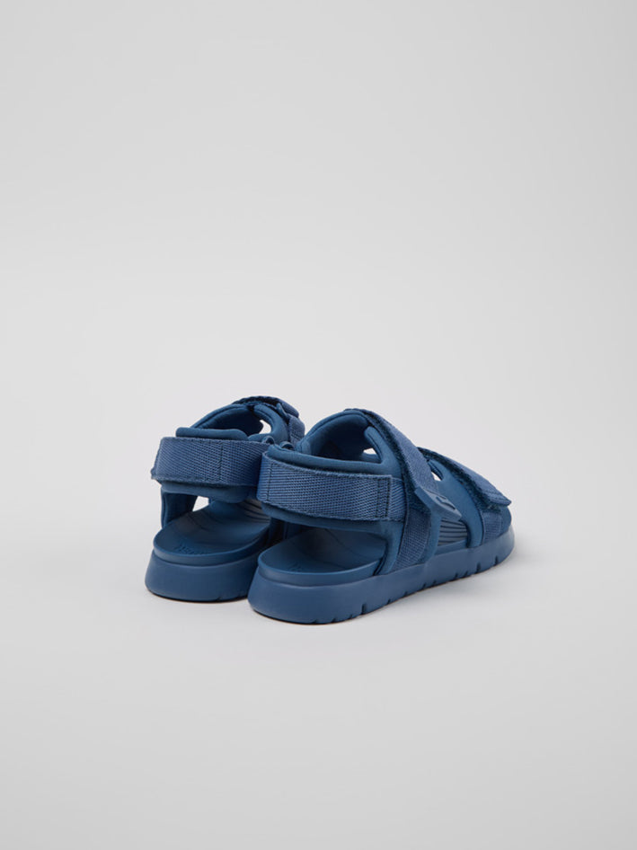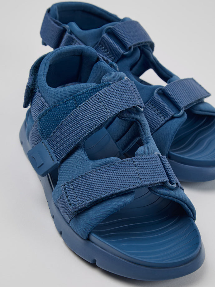 Children's Sandals made of water-friendly textile in blue with Velcro fastening and EVA outsole. The light and flexible Oruga in Blue combines Camper's characteristic urban style with soft leathers and textiles. Lining 59% recycled polyester, 41% EVA
