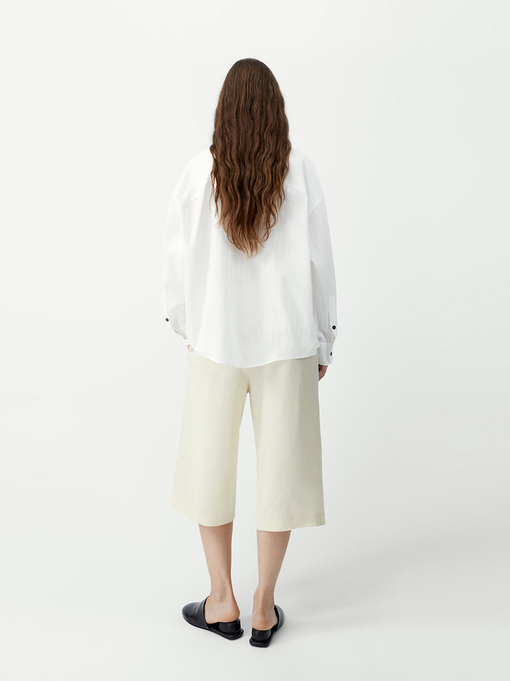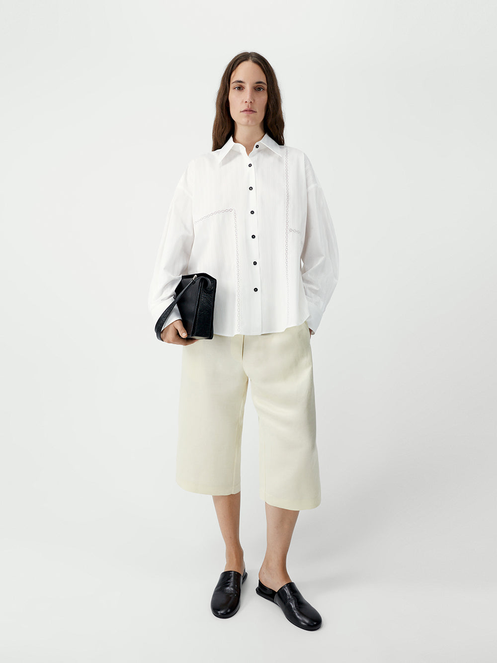 This oversized shirt features a relaxed, fluid silhouette with a softly structured back that adds gentle volume. Crafted from a charming white-on-white pinstripe fabric, it plays with delicate lace detailing for a subtle, sophisticated texture. An Italian collar and front button closure, with contrasting black buttons, complete this light and effortless piece, combining playful charm with timeless appeal.