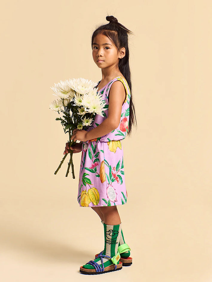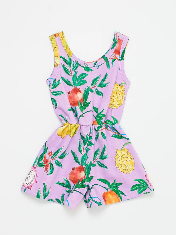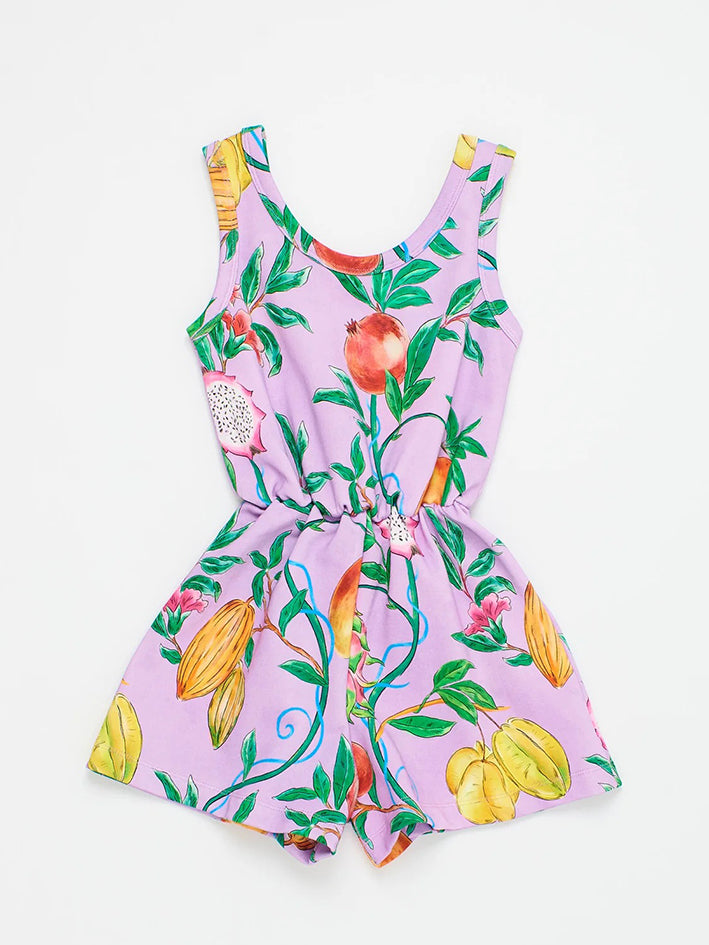 The Lilac Passion Fruit Jumpsuit by Maison Mangostan is a breezy short jumpsuit crafted from soft cotton jersey, featuring an all-over passion fruit print. An elastic waistband ensures a comfortable, gathered fit. Made in Portugal. Composition: 100% Organic cotton This item is normally sized, we suggest you select your regular size.