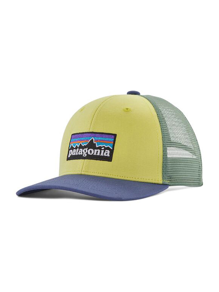 The reliable Kids' Trucker Hat in Nearly Green by Patagonia features an organic cotton front and visor, a recycled polyester mesh back, and an adjustable fit.