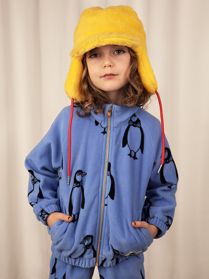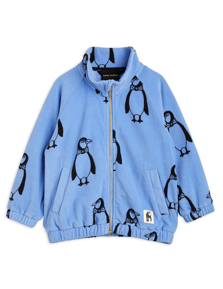 Penguin printed Fleece Jacket by Mini Rodini made from 100 % recycled polyester with a panther label in the front.