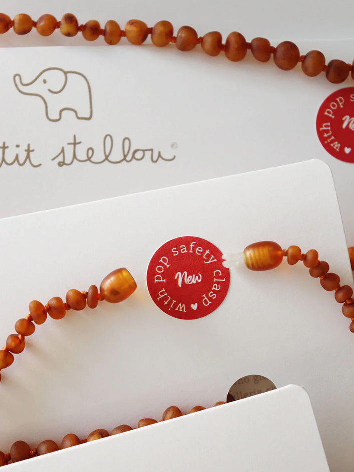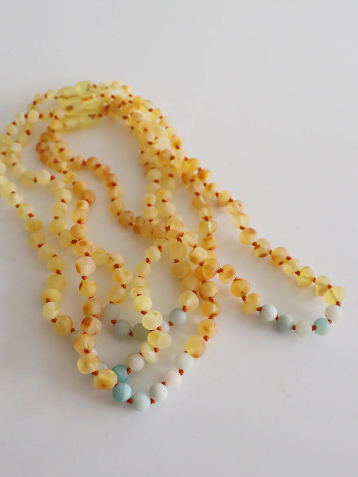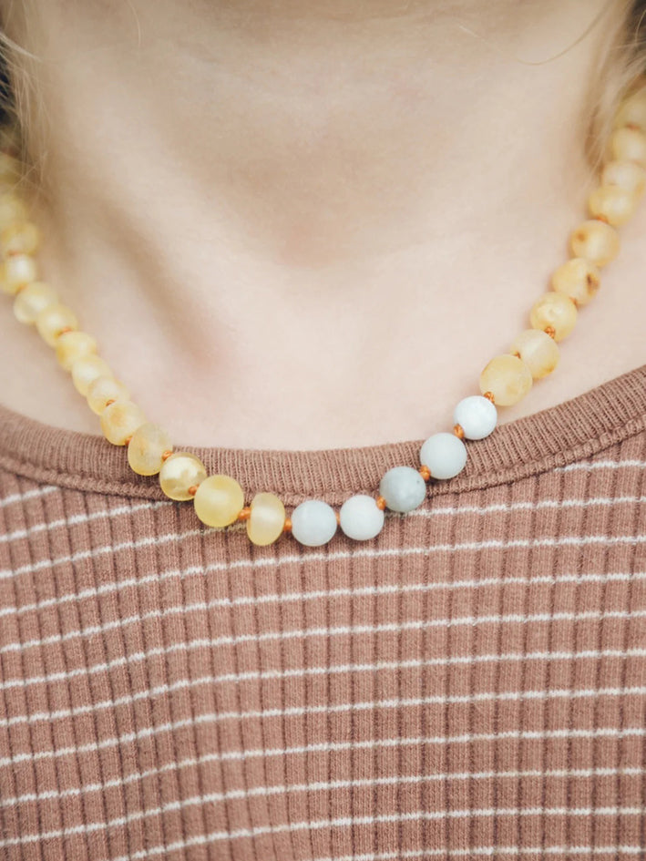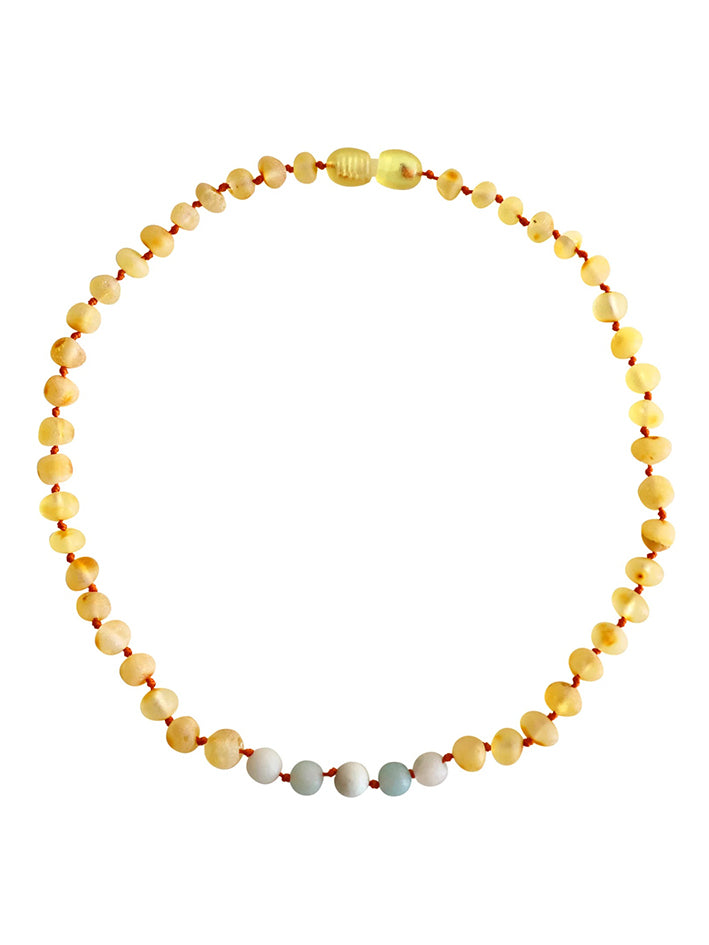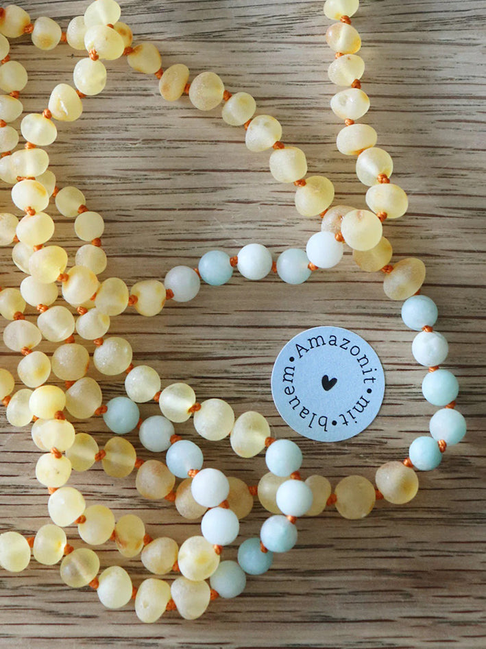The Baby Amber Necklaces Lemon Blue Amazonite by Petit Stellou are handmade unique pieces from Baltic natural amber, which are lovingly produced in small manufactures in Lithuania. We have consciously chosen the raw, unpolished pearls - natural, simple and beautiful ... matching the Petit Stellou style. With the natural product amber, the colour, shape and size of the stones are always slightly different. This makes each necklace unique. - Baltic natural amber - With gemstone: Blue Amazonite - Handmade single piece - Raw and unpolished - Individually knotted - Pop safety clasp - ± 32 cm