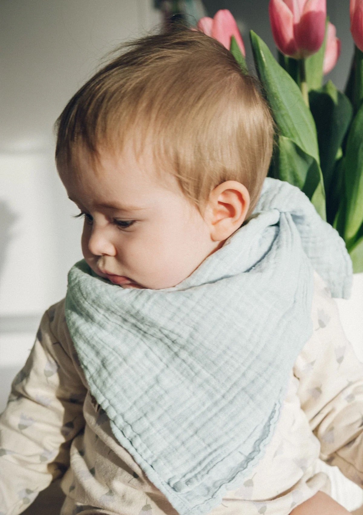 The Petit Stellou Nooshi in Seafoam is to cuddle and snuggle ... for at home and on the go ... instantly protecting baby's sensitive head from sunshine or wind ... stylish dry bib ... In baby soft, "soft pre-wash-crinkle" quality. Size: approx. 65 x 65cm Material: 100% GOTS certified organic muslin cotton Made in Portugal - Good from the start!