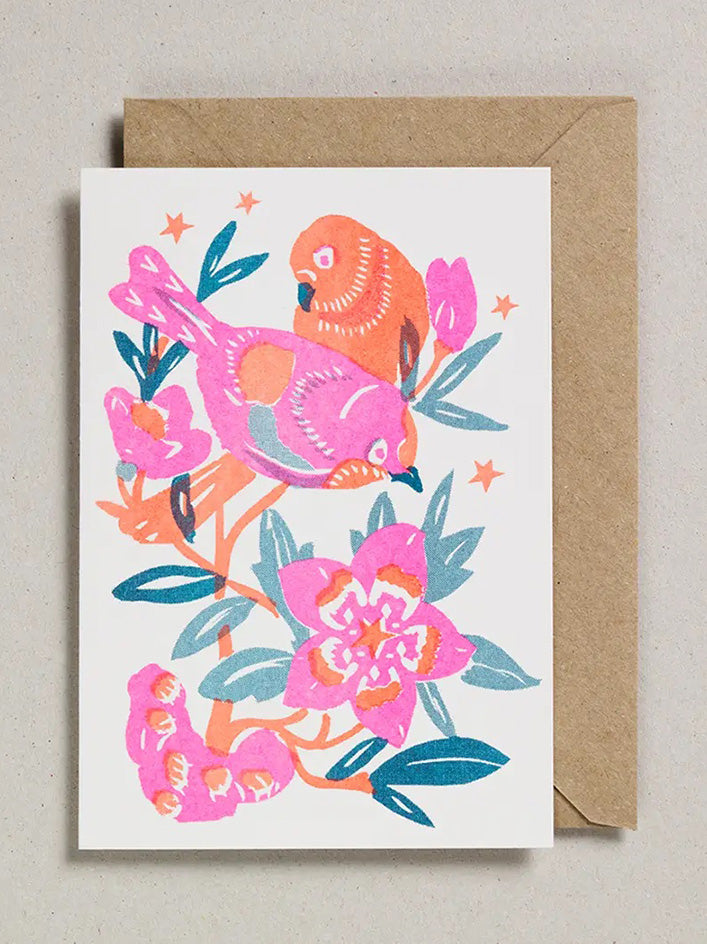 Each card is a unique riso print using soy-based inks. Please note the fluorescent colors do not show up well in photography. Blank inside for your own message. 105mm x 150mm