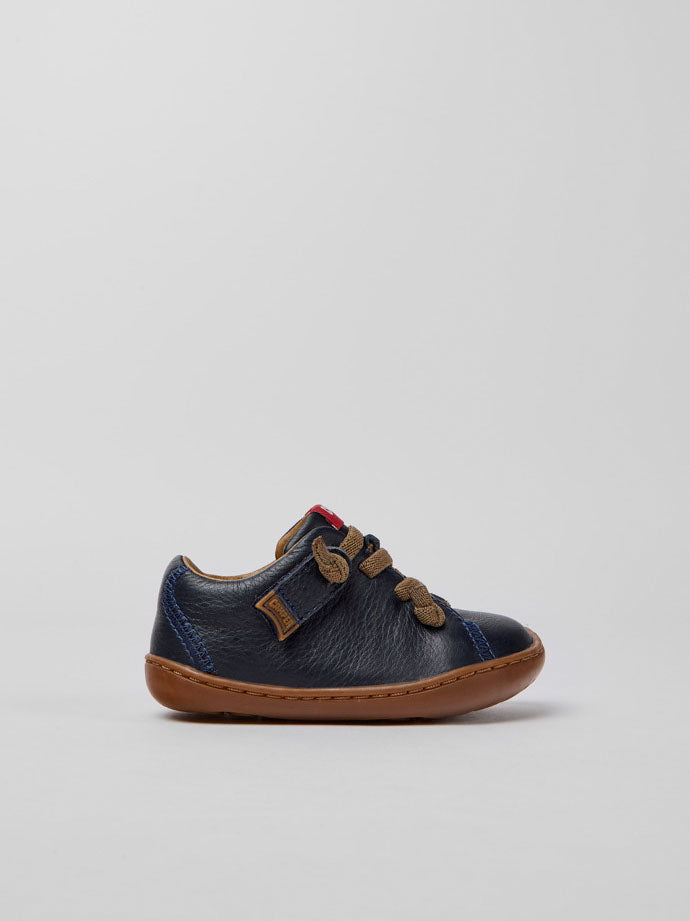 Navy Blue leather kids' shoes with Elastic laces and rubber outsoles (20% recycled). A Camper Icon that evolves with every season. Peu is functional simplicity inspired by walking barefoot. It is 360-degree stitched and built with a Strobel construction technique, guaranteeing unmatched flex and durability under any conditions.