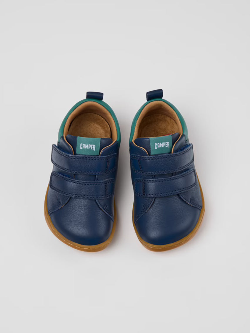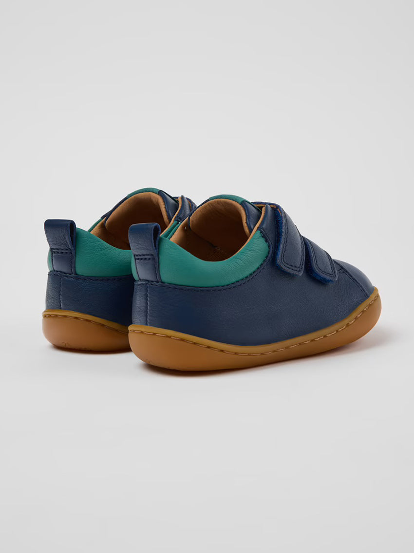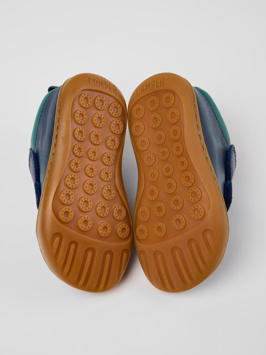 Blue/Green leather children's Sneaker with Velcro fastening, EVA footbed and rubber outsole. The First Walkers offer flexible yet robust shoes for your first steps. The Peu is a Camper cult object that presents itself in a new look every season. The Strobel design with all-round seams guarantees unrivaled flexibility and durability in every situation.