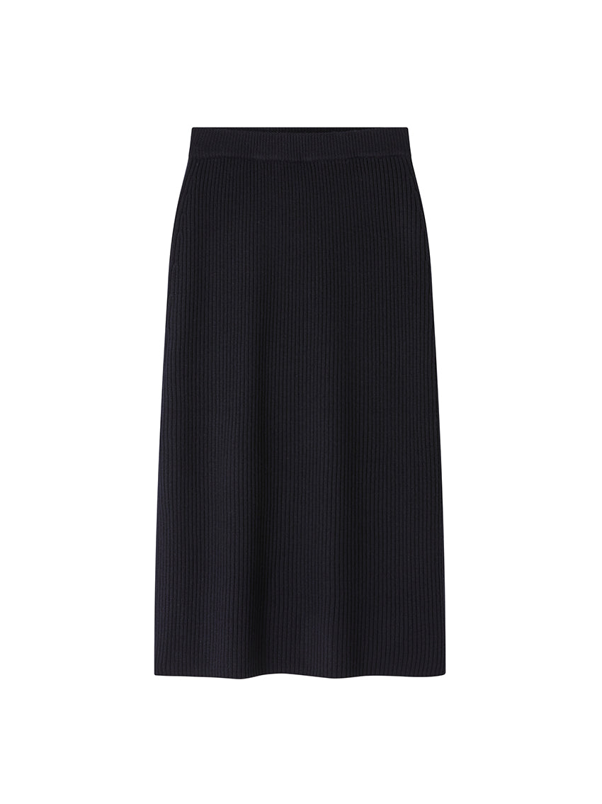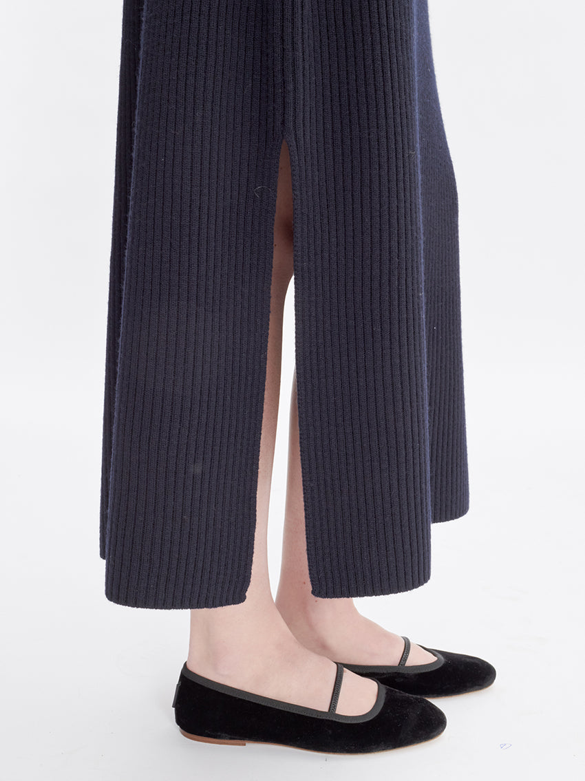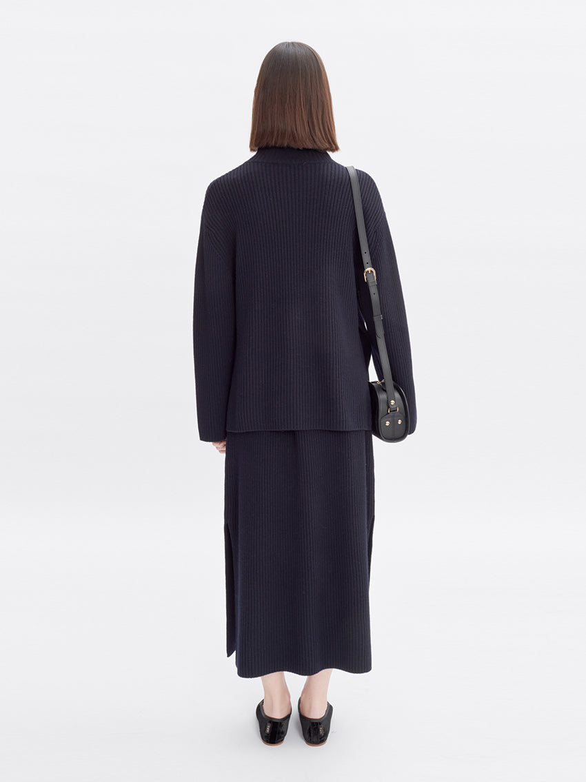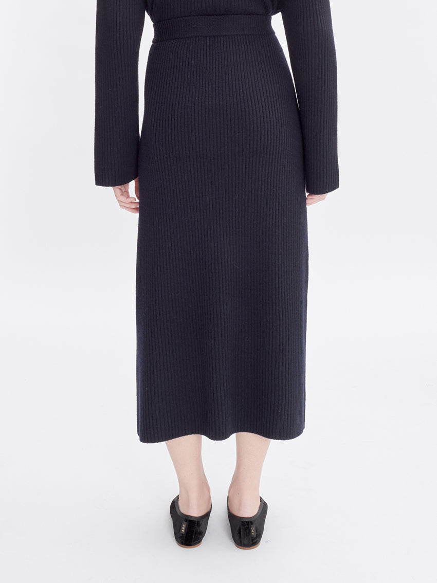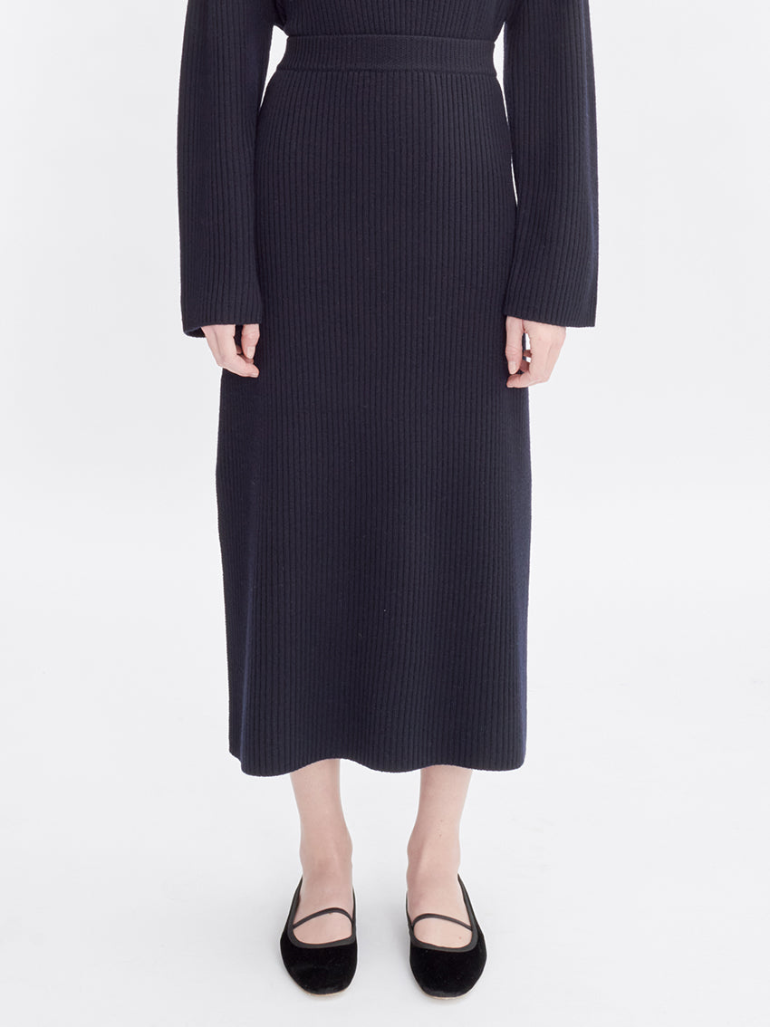 A.P.C. Phoebe Long Dark Navy blue Merino Wool Skirt. Soft, warm and ribbed material. Mid-rise. Mid-calf length. Elasticated waistband. Side slits. 100% wool. Made in China. Hand wash or delicate cycle.