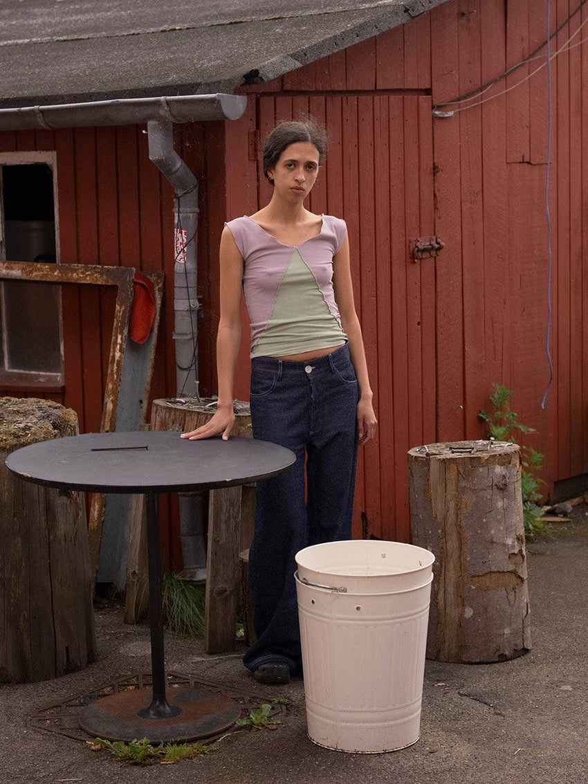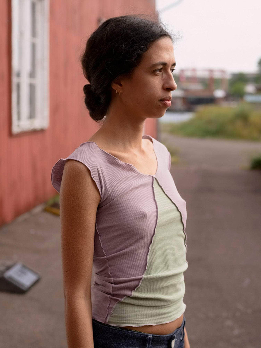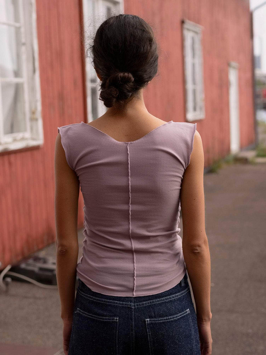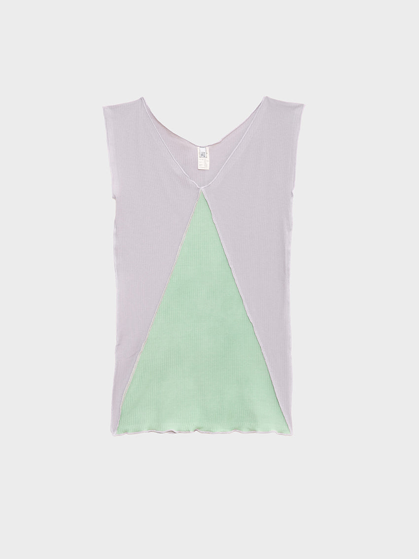 An organic cotton rib tank with contrast fabric panels, a V-neck, and exposed seams. Finished with a delicate lettuce edge at the neckline and hems.