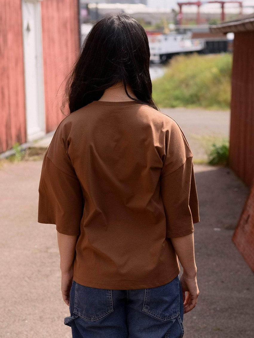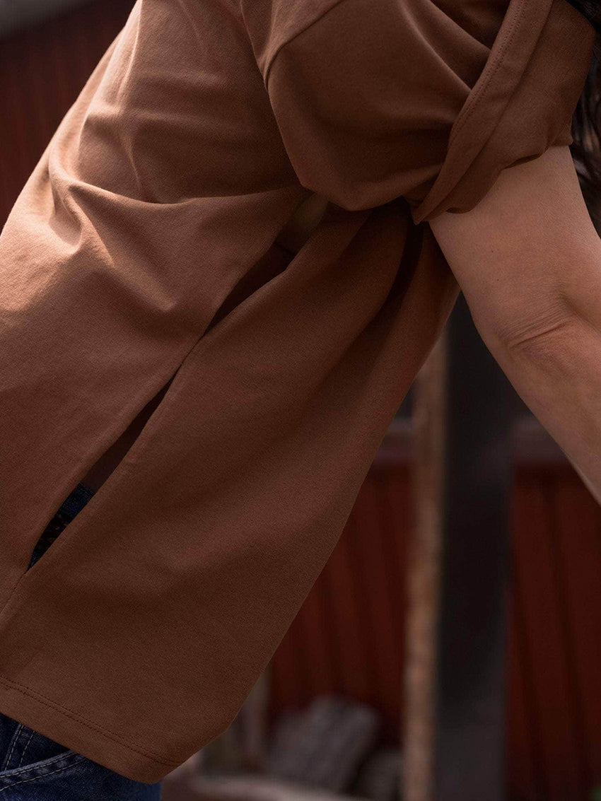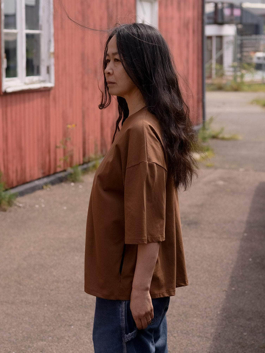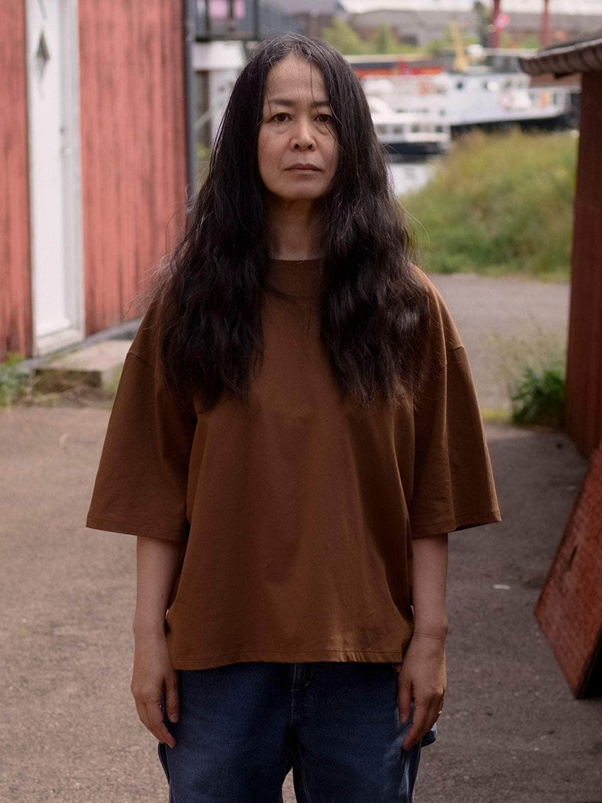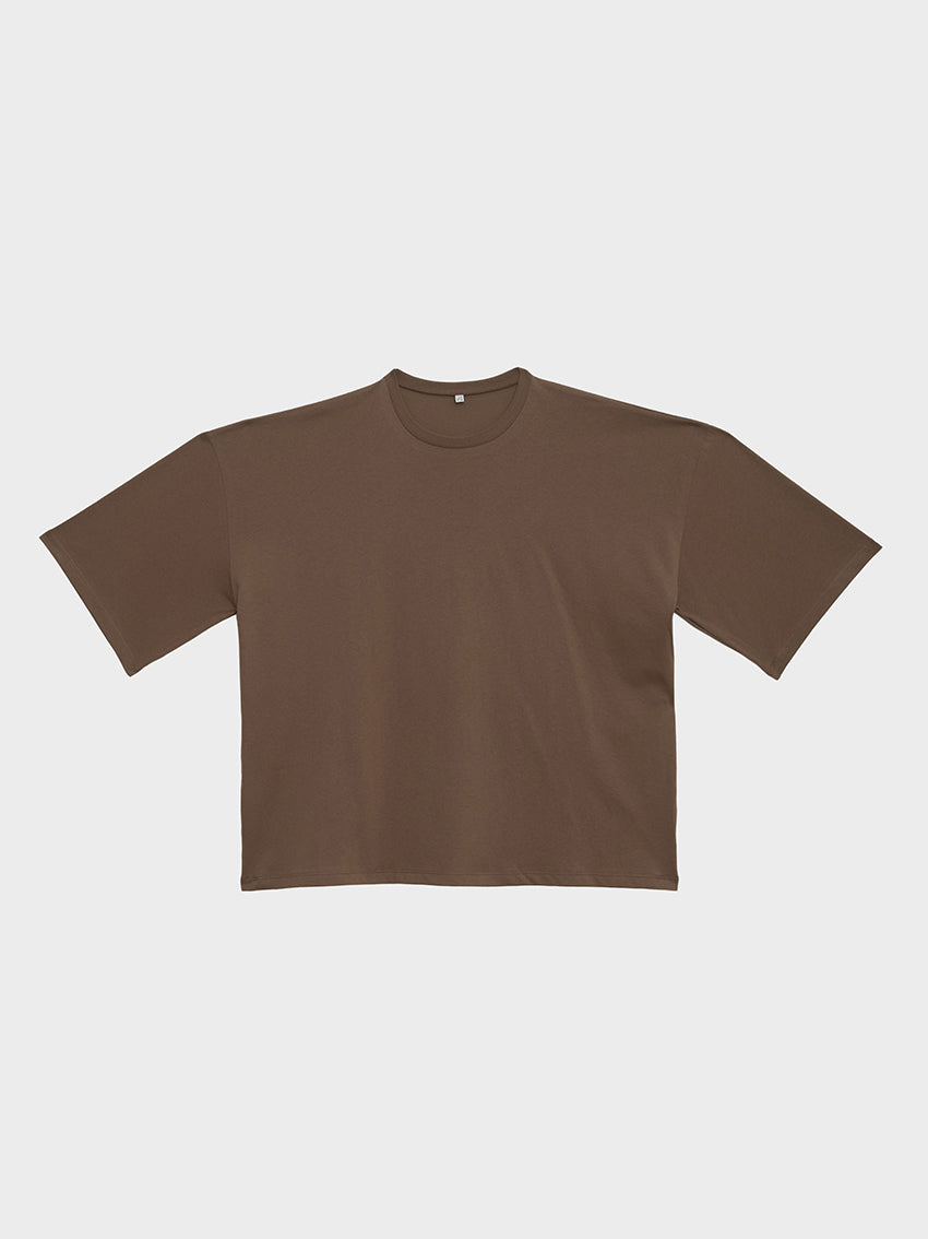 A crewneck tee made from regenerative cotton, designed with side-seam slits and an oversized fit. Consider sizing down for a closer fit.