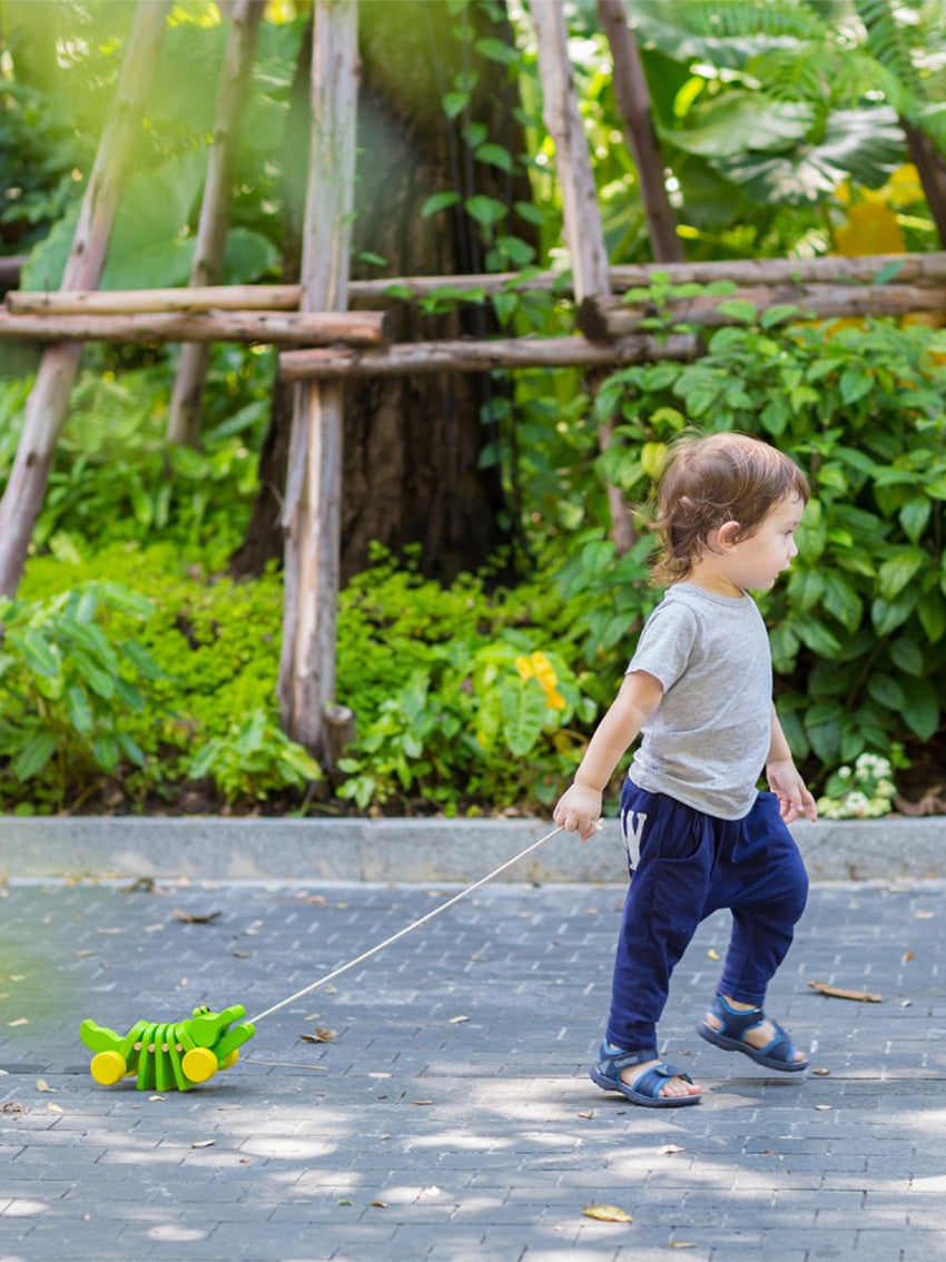 While being pulled, the wooden pieces make rhythmic click-clack sounds. Suitable for children 12 months and up.