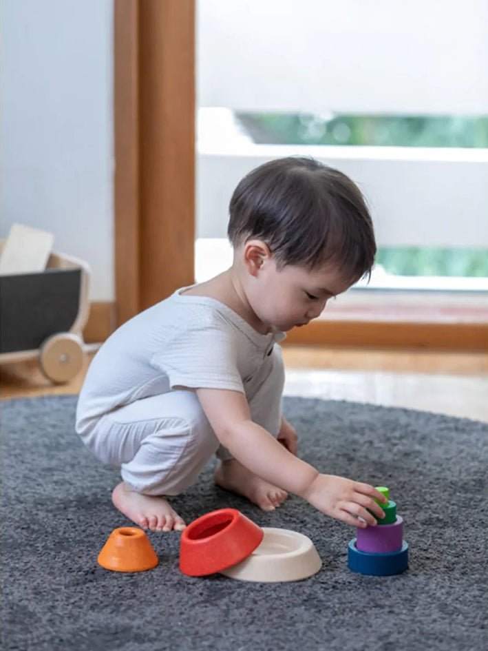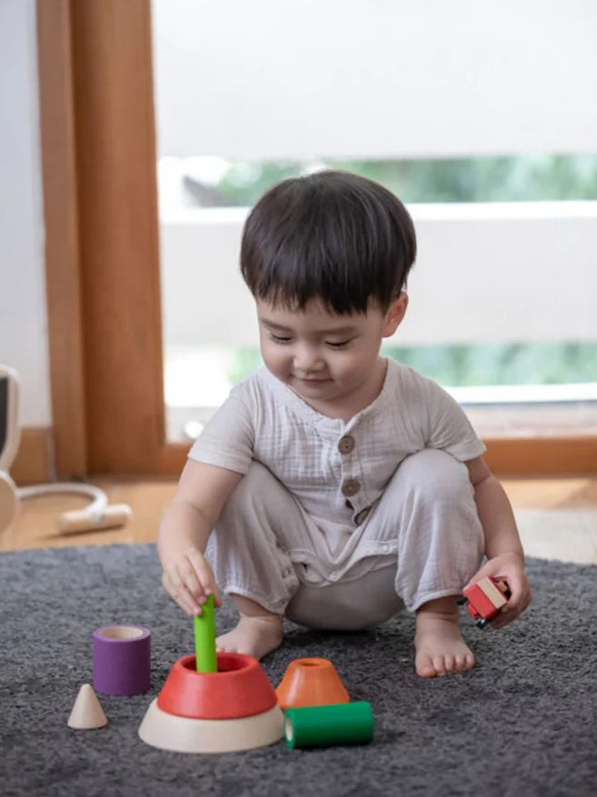 stacking these colorful cones and cylinders in the PlanToys Cone Sorting set. The set comes complete with nine pieces. Compatible with other block sets in the Unit Plus series. These nesting cones and cylinders will bring children delight as they stack and nest them together Great visual teaching aid when learning about shapes, colors and patterns. This set is part of the Unit Plus series and can be used on its own or in combination with any other Unit Plus series set. Sustainably made in Thailand with chemical-free rubberwood trees, formaldehyde-free glues, organic pigments, and water based dyes.