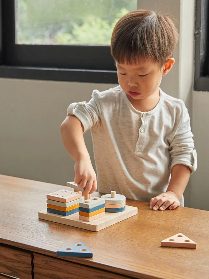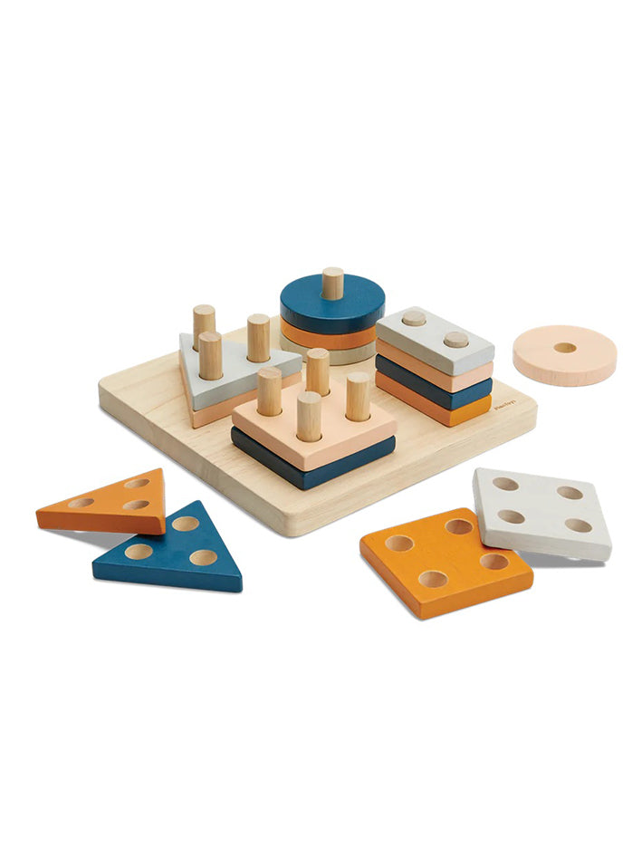 A set of 4 colorful Geometric shapes can be stacked together according to the number of holes in the middle of each shape. The Plan Toys Geometric Sorting Board is sustainably made in Thailand with chemical-free rubberwood trees, formaldehyde-free glues, organic pigments, and water based dyes.