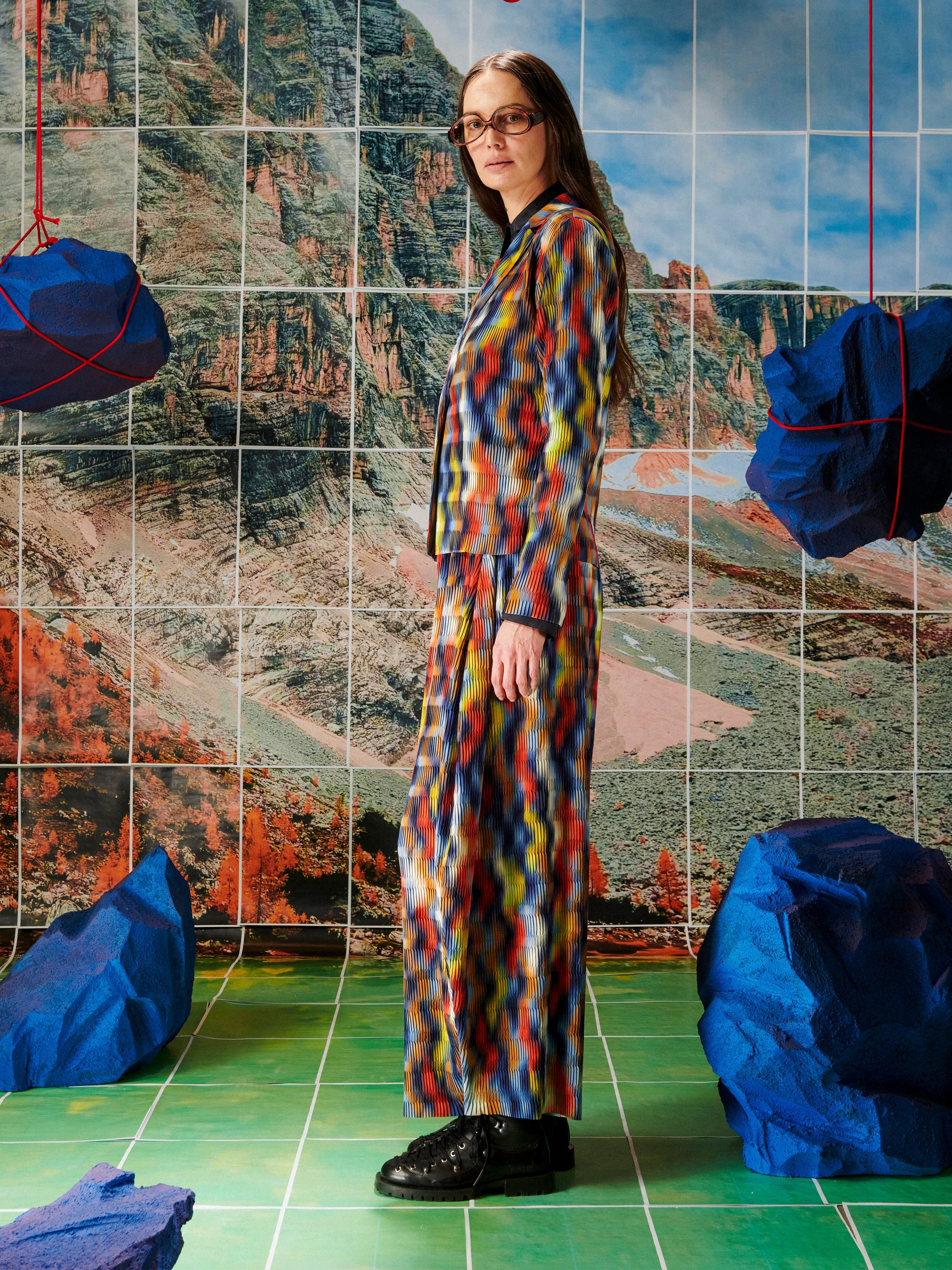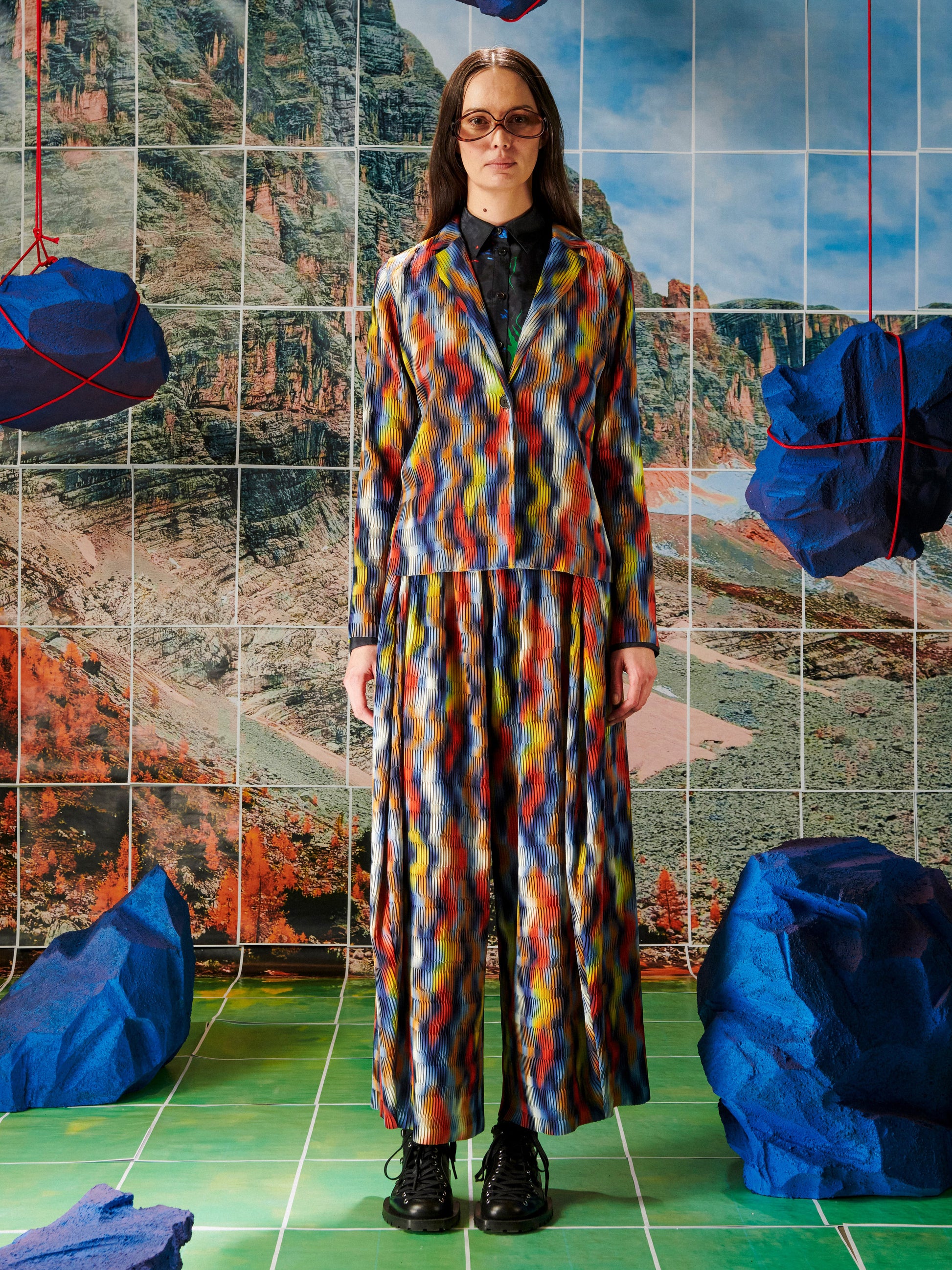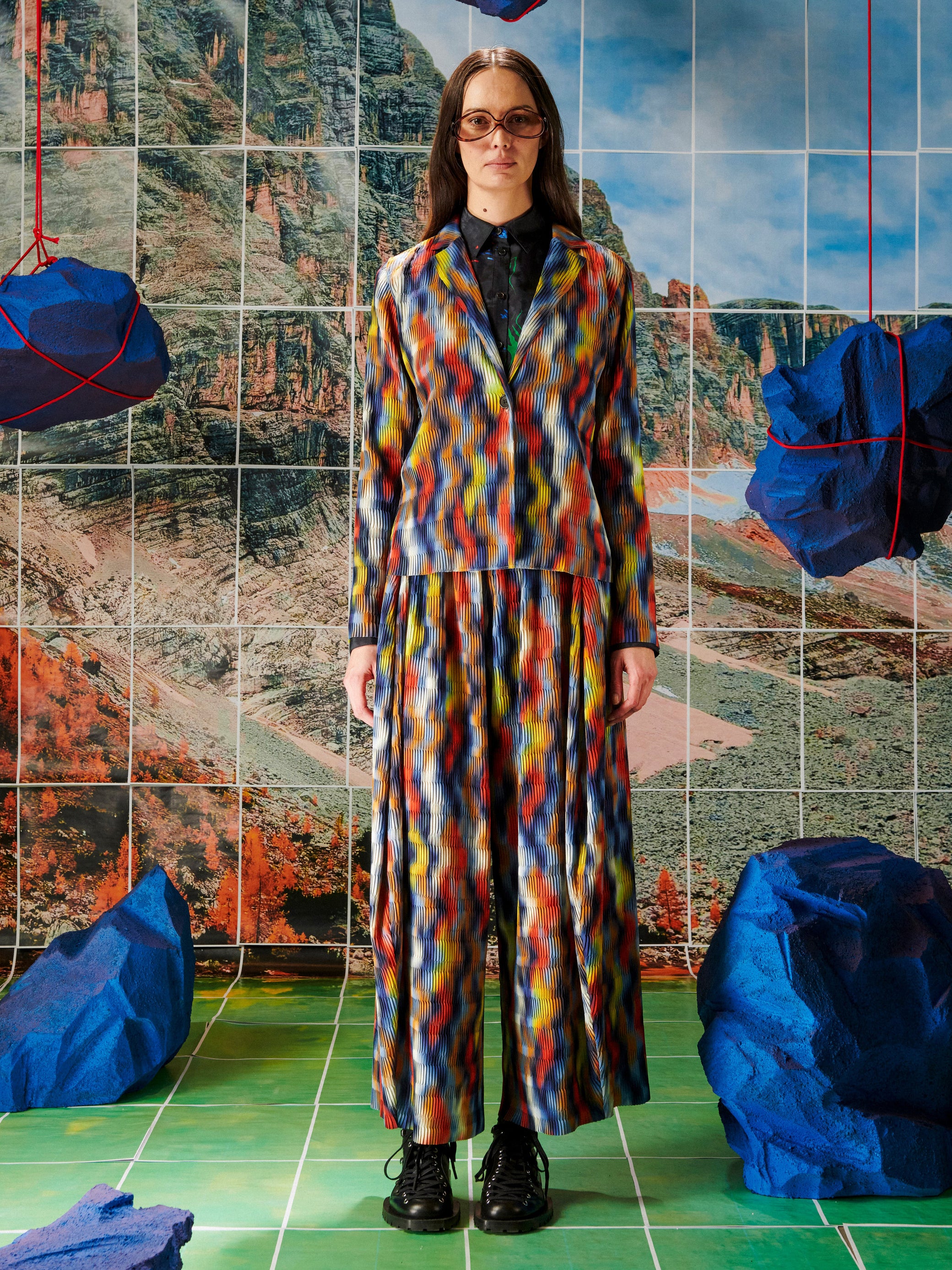 The Plissé Blazer in Wavy Cubes from Henrik Vibskov’s AW25 Key Collection features a multicolour plissé finish, a front button closure, long sleeves, and straight hems. A statement piece with a sculptural texture and a refined, tailored silhouette.