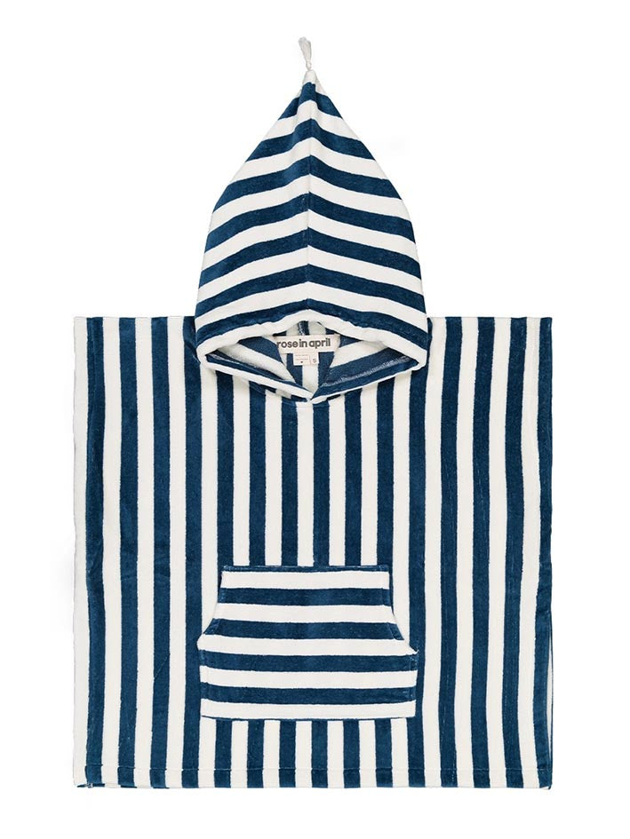The Suzon Stripes terry toweling bath Poncho in Blue Midnight from Rose in April will be perfect for drying your little ones after getting out of the bath. Your children will love wrapping themselves up in it! Also use for trips to the beach or swimming pool. Dimensions: 1/3 years - height (from neckline to bottom of poncho): 49cm, width: 52cm. 4/6 years - height (from neckline to bottom of poncho): 62cm, width: 65cm Composition: 100% Cotton terry - 380gr Made in Portugal Cotton OEKO TEX certified