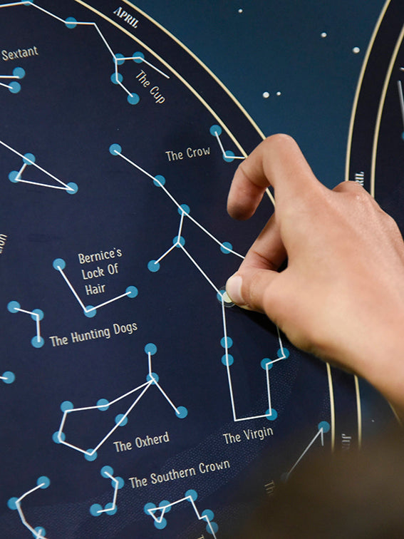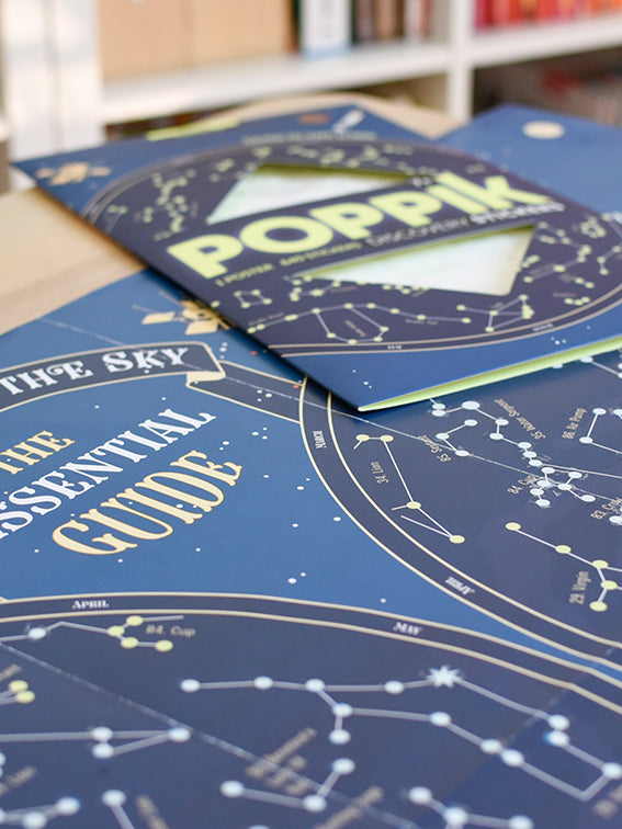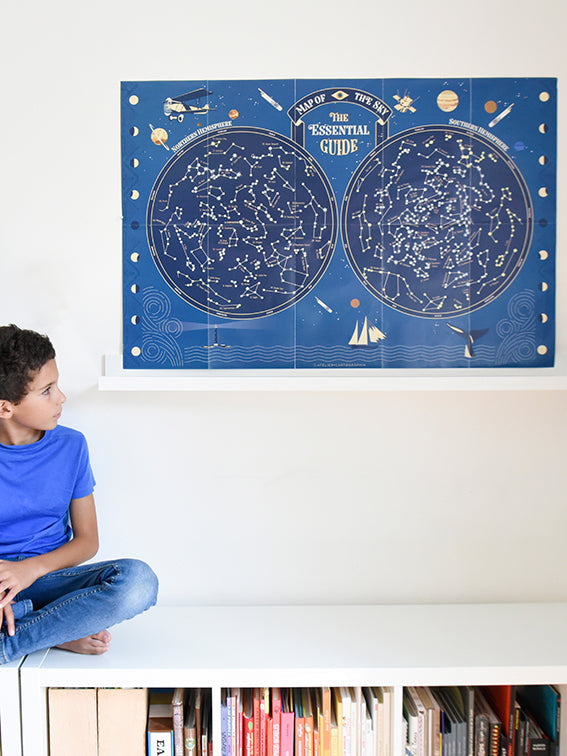 Unfold the large poster and stick the phosphorescent stars of the most famous constellations. The two hemispheres, North and South, are represented. A notice in 5 languages (English, French, Spanish, German and Italian) allows to know the name of each constellation. When you turn off the light, you can have fun finding the constellations, recognizable by the position and size of the stars. Content : 1 poster (1 m x 68 cm) + 640 stickers Glow-in-the-dark and removable stickers 7 and up Design : Atelier Cartographik