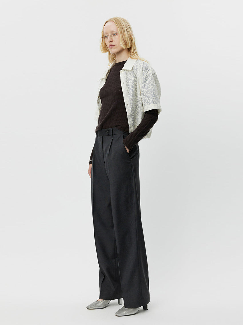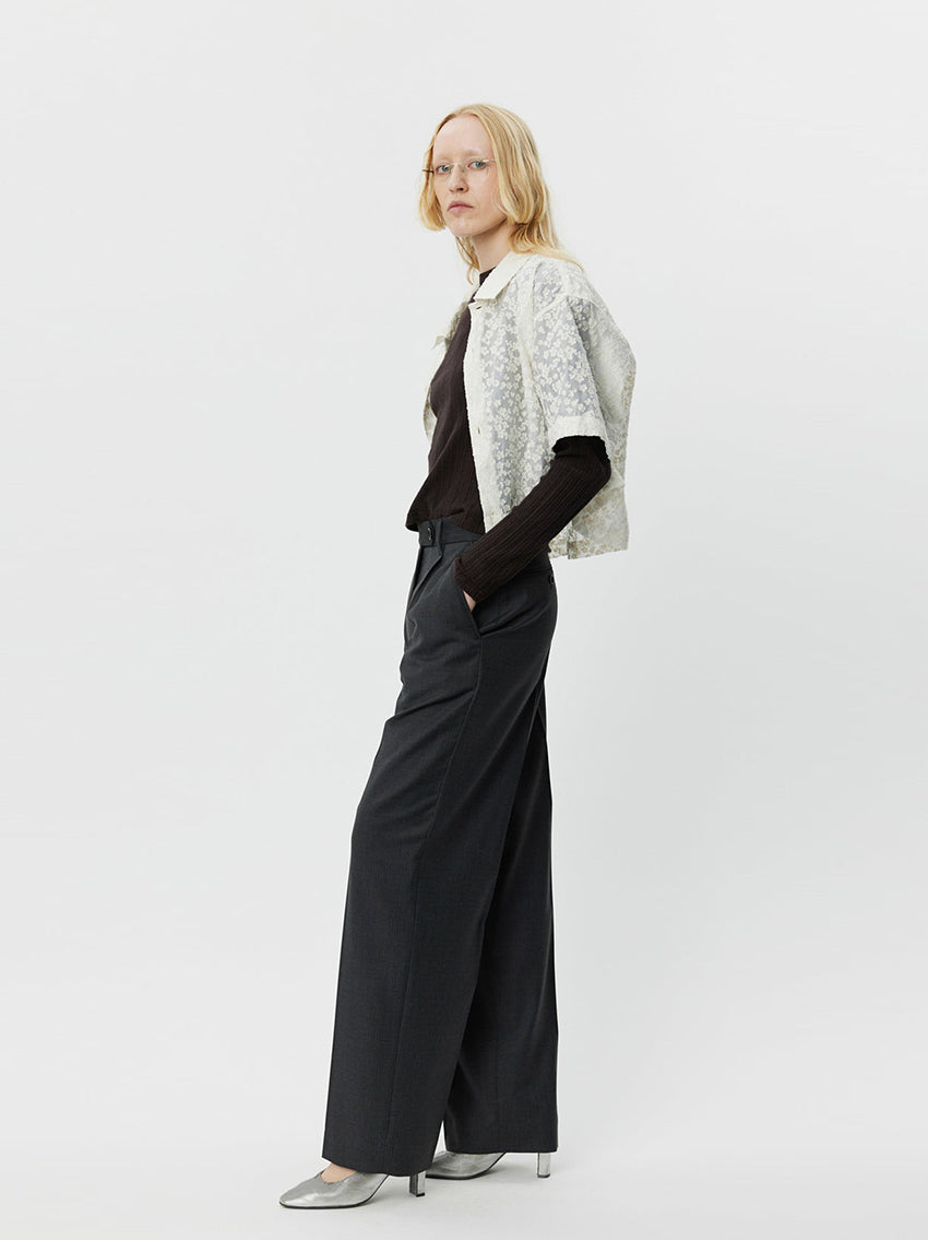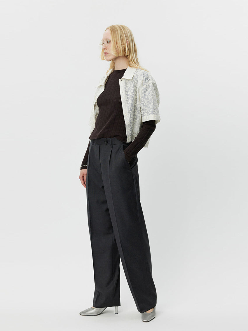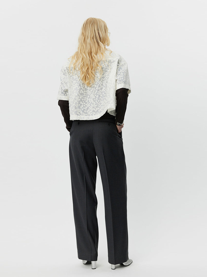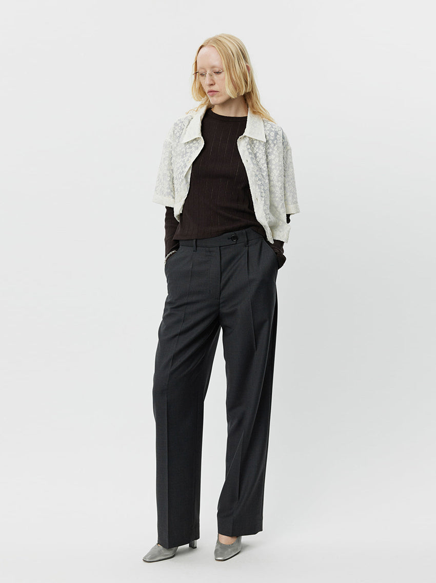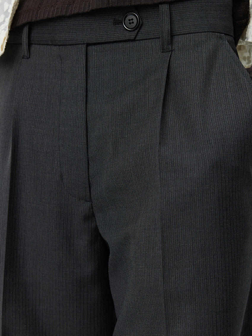 Cut from an Italian deadstock wool with a fine grey multi stripe on a grey ground.